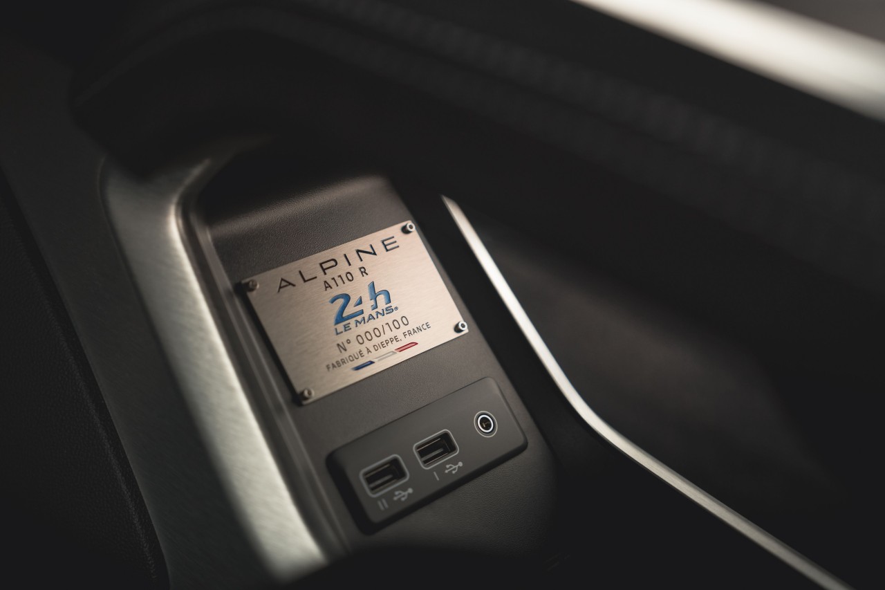 Die limitierte Sonderserie trägt darüber hinaus die offizielle Signatur der 24 Stunden von Le Mans an den Frontspoilern, Seitenschwellern und Mikrofaser-Kopfstützen der Sabelt Track-Schalensitze. Als weitere Referenz an den Langstreckenklassiker ist das Layout des Circuit des 24 Heures per Laser auf die Sonnenblende graviert. Den exklusiven Charakter der A110 R Le Mans betont schließlich eine nummerierte Plakette mit der offiziellen Signatur des 24-Stunden-Rennens.