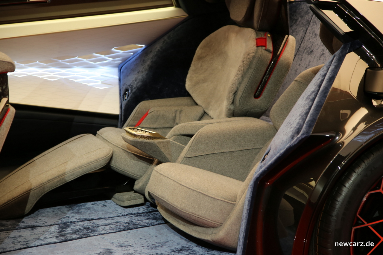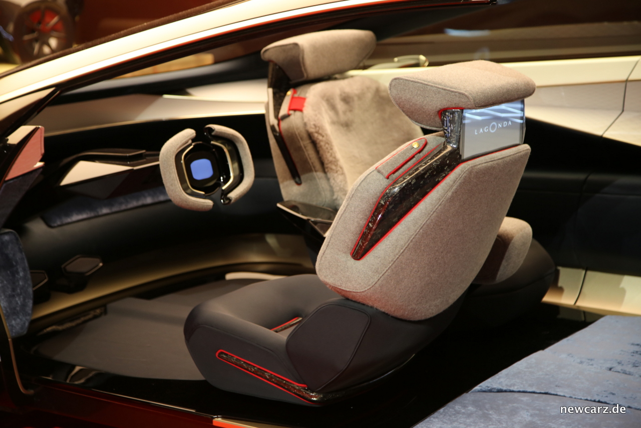 Im Innenraum des Lagonda Vision Concept herrscht ein genauestens aufeinander abgestimmtes Potpourri an Materialien, welche designtechnisch in harmonischer Akkuranz zusammengeführt wurden. Seide, Kaschmir oder handgewebte Wolle findet man ebenso wie High-Tech-Materialien in Form von Carbon und Keramik.