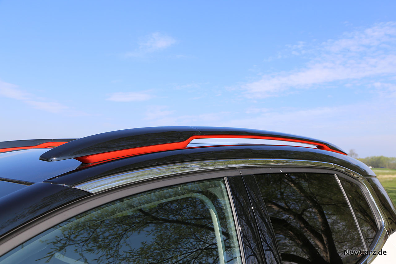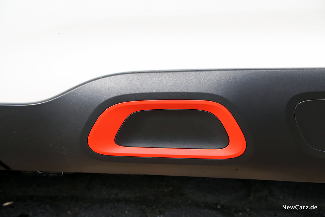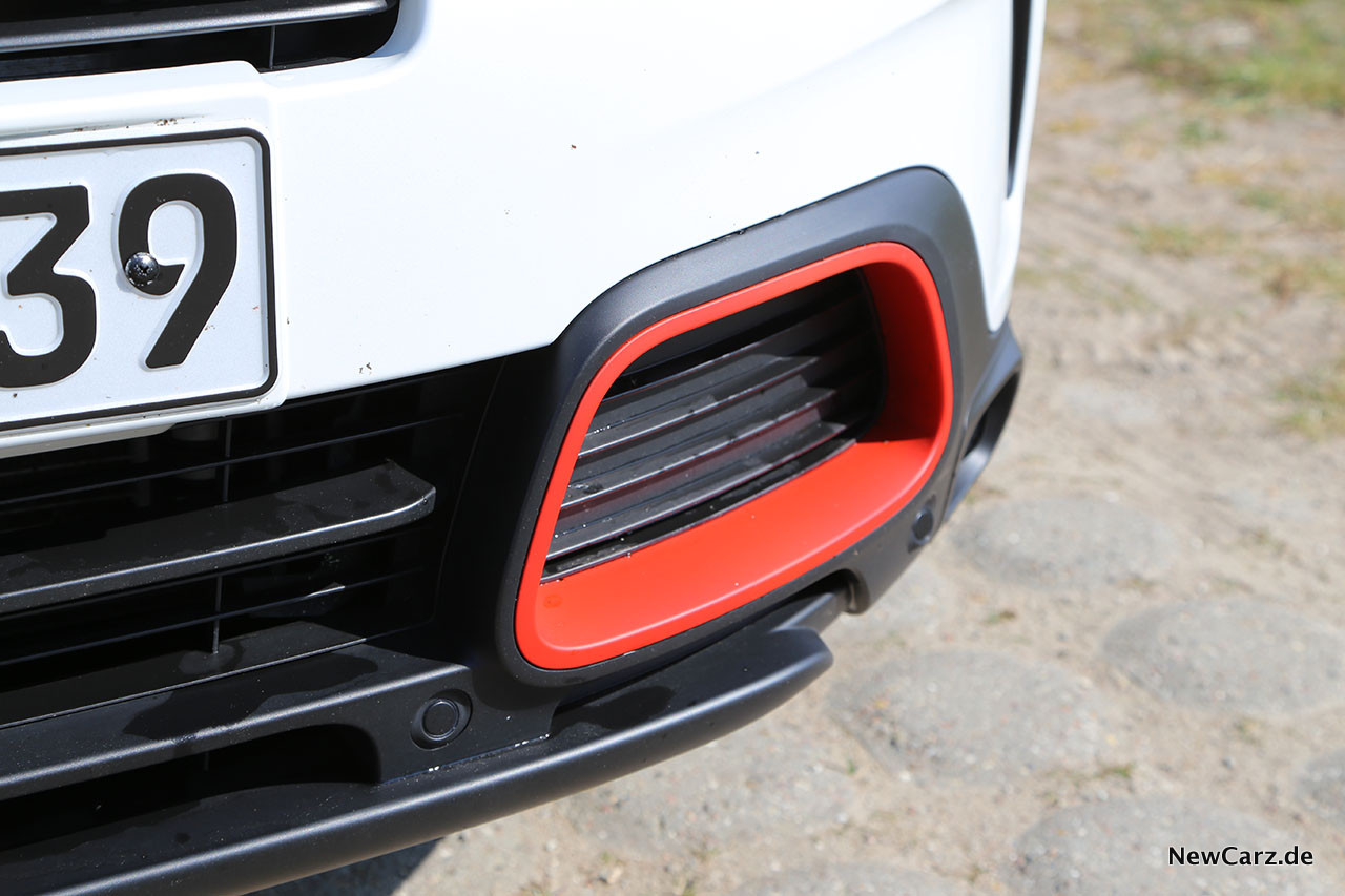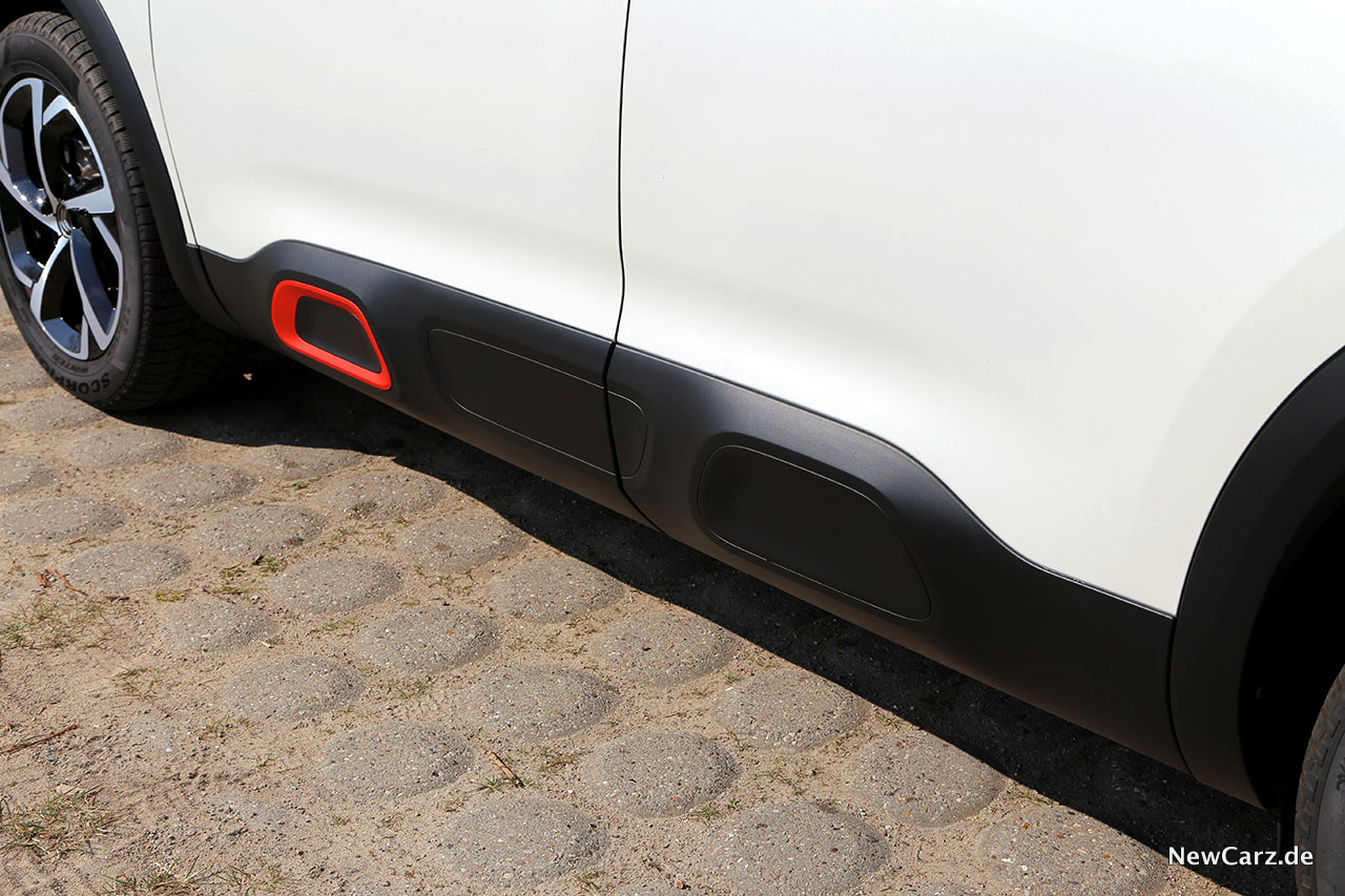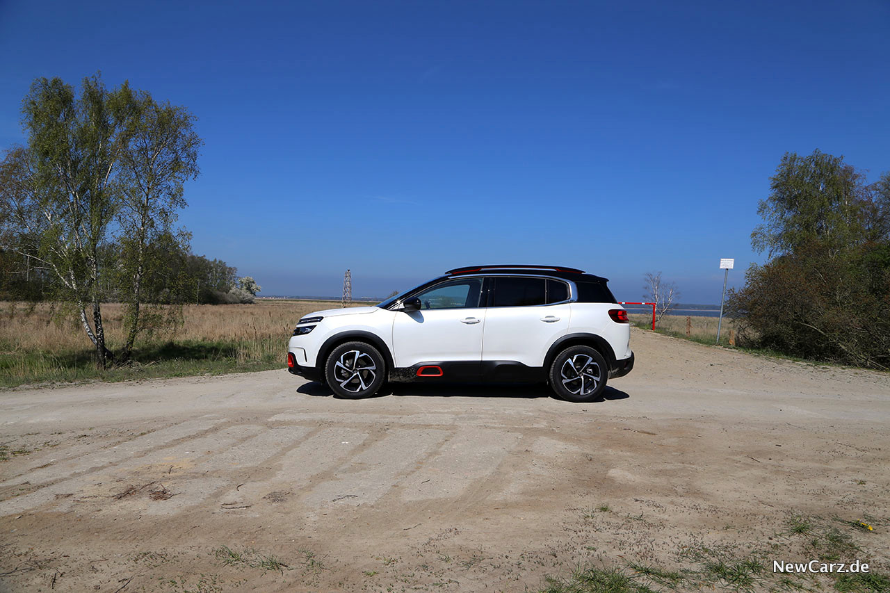 Der Nachfolger des C4 Aircross zeigt sich modern und stylisch, wie man es von vielen Modellen der französischen Marke gewöhnt ist. Dabei fallen viele Ähnlichkeiten zum Citroen C3 Aircross auf, doch insgesamt wirkt der C5 Aircross in jeder Hinsicht größer. Die fast schon traditionell zu bezeichnenden Airbumps an den Flanken wurden an diesem SUV dezenter ausgeführt, wobei der erste „Bump“ hier im Rahmen des für 100 Euro angebotenen Style Paket Red eine rote Umrandung erhielt – es gibt diese auch in Weiß – was auf dem schwarzen Untergrund wunderbar akzentuiert.
