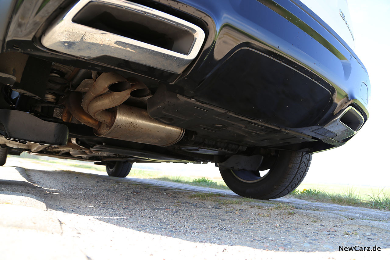 Am Heck fallen zuerst die großen Heckleuchten auf, die eine Signatur besitzen, welche verdächtig an das „Flying B“ eines Bentley Bentayga erinnert. Ansonsten dient ein in klavierlackschwarz gehaltener Heckdiffusor mit zwei flachen Endrohr-Imitaten als kontrastreiches Finish des Heckabschlusses.