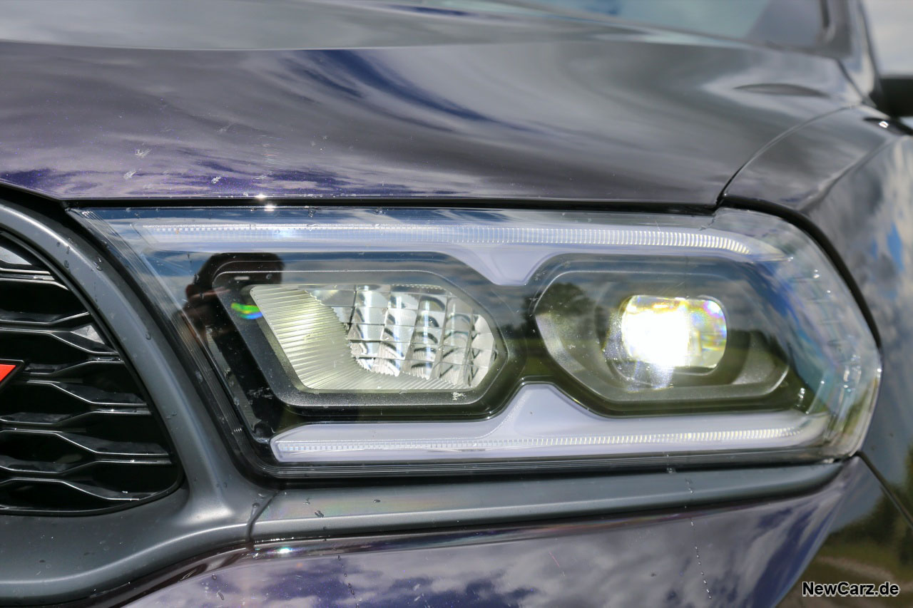 Ausgestattet ist der Durango wie die meisten US-Automobile sehr üppig. Wir gehen nachfolgend auf die wichtigsten Dinge ein. Das Über-SUV besitzt beispielsweise sehr gute LED-Scheinwerfer, die zwar nicht adaptiv arbeiten, jedoch mit ihrem hellen Lichtteppich und der enormen Reichweite allein des Abblendlichts absolut überzeugen können und nicht selten das Fernlicht vergessen lassen.