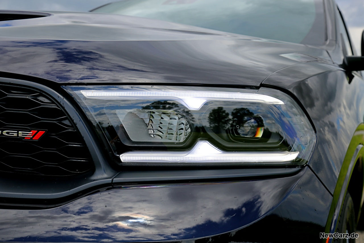 Der Dodge Durango erscheint selbst im Vergleich mit deutschen Performance-SUVs extrem bullig und groß. Die Front blickt grimmig drein, markant akzentuierte Scheinwerfer mit dem neuen, sehr modern interpretierten Tagfahrlicht wirken auf jedermann einschüchternd und die enorme Anbauhöhe führt nicht selten dazu, dass man nachts kleineren vorausfahrenden Fahrzeugen den gesamten Innenraum illuminiert.
