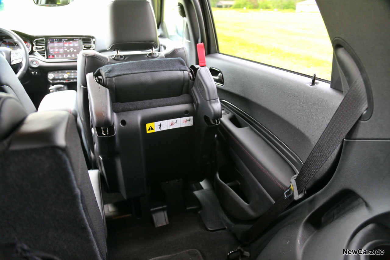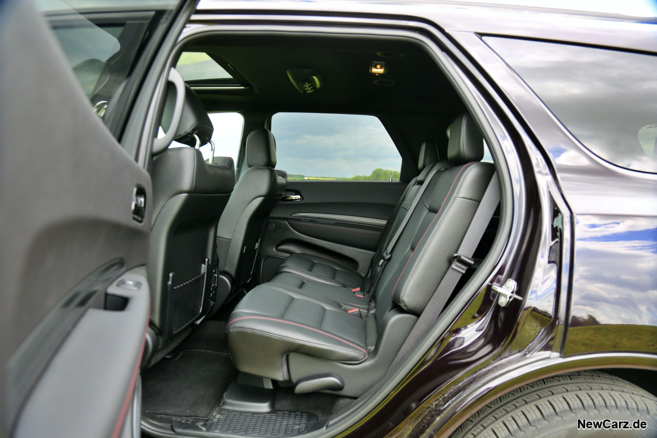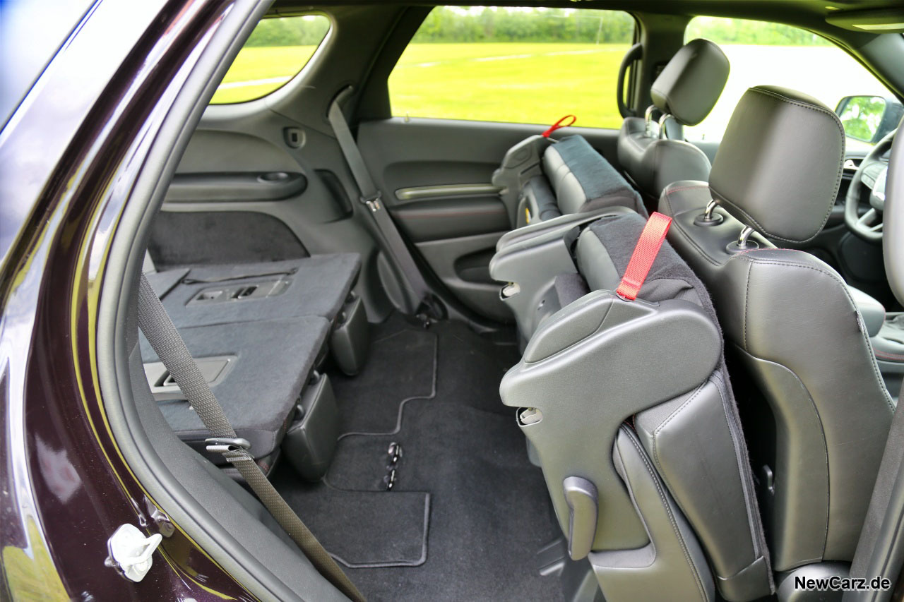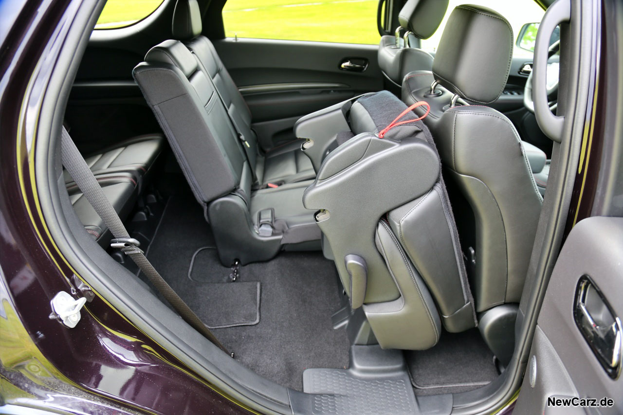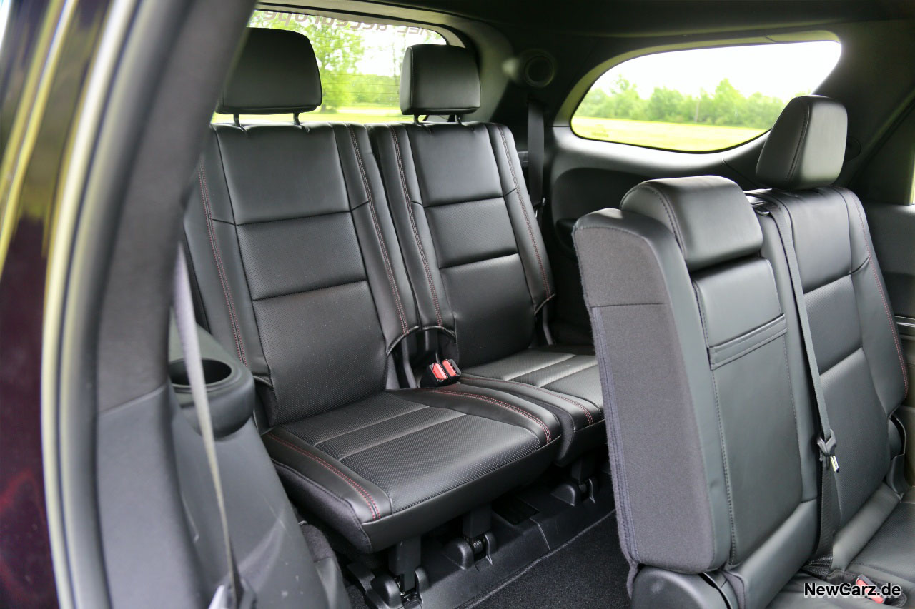 So gesehen, ist der Dodge Durango der erste 7-Sitzer mit tatsächlich sieben vollwertigen und auch langstreckentauglichen Sitzplätzen. Zum Ausstieg zieht der Passagier auf der dritten Sitzreihe nur eine Schlaufe am Sitz davor, und der Sitz klappt einfach komplett nach vorne weg. Das funktioniert mühelos und kinderleicht mit einem Handgriff.