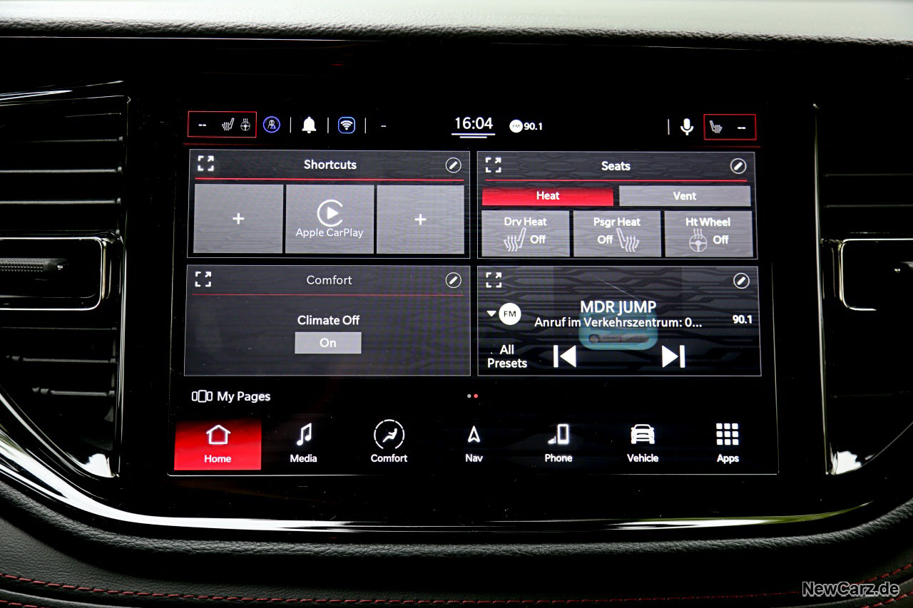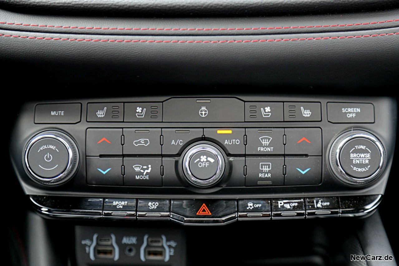 Das Bedienkonzept ist schlüssig, wirft lediglich eventuell anfangs aufgrund der recht vielen Tasten vereinzelt Fragen auf. Die Klimaeinheit verfügt über große physische Tasten, sodass die Bedienung auch während der Fahrt keine große Ablenkung darstellt. Das gilt auch für den großen Zentralbildschirm, der durch die Zugehörigkeit zum FCA-Konzern auch Jeep-Fahrern geläufig sein dürfte.