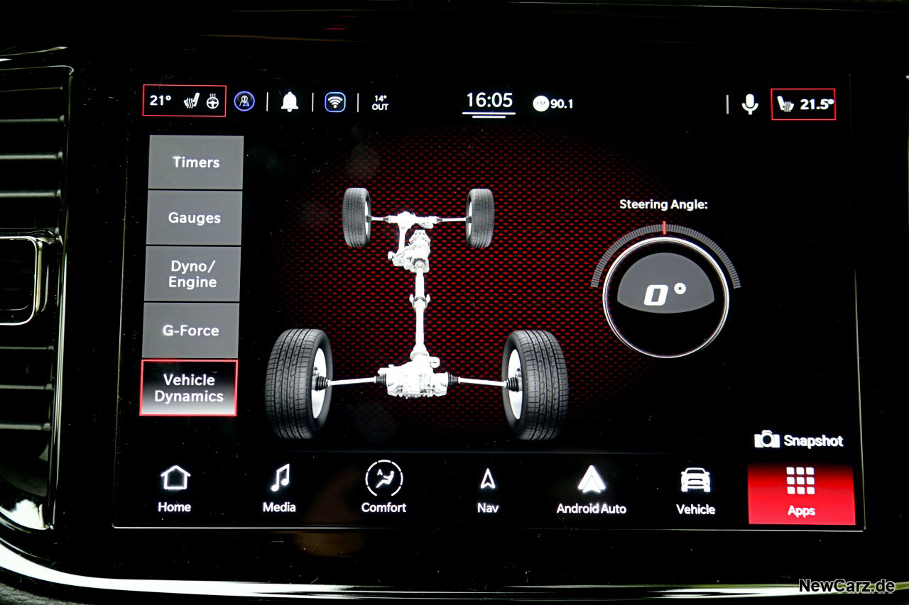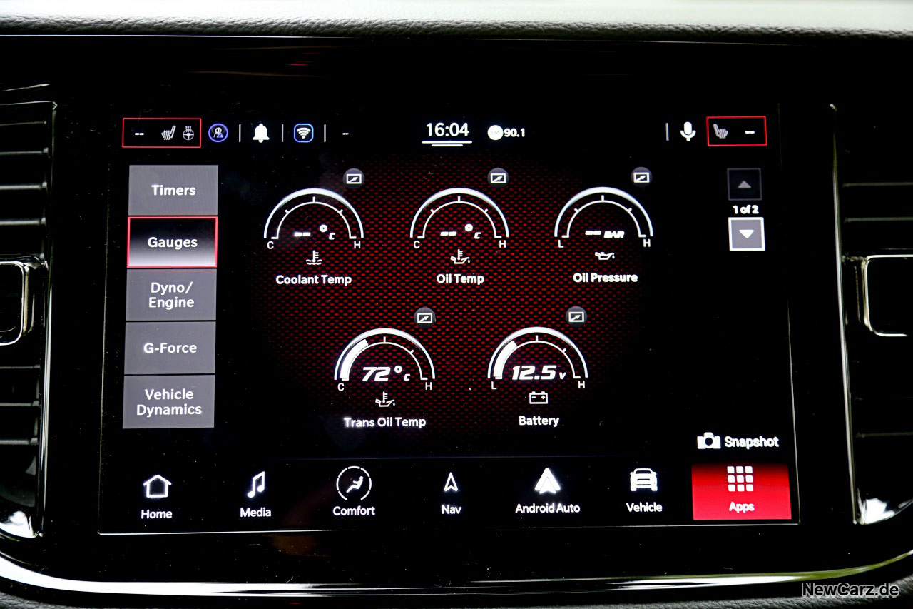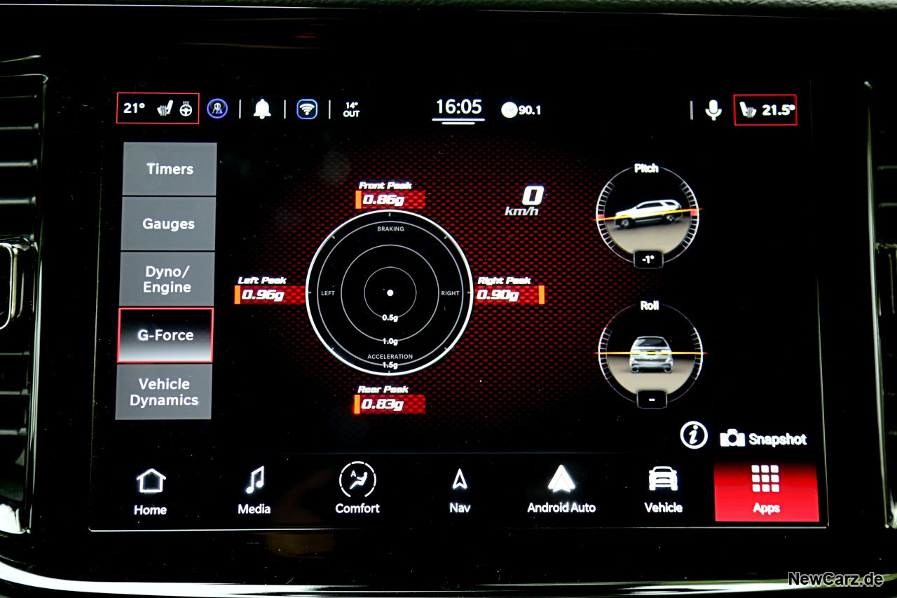 Das reicht vom aktuell bestehenden Drehmomentverlauf über die Temperaturen sämtlicher Betriebsmittel bis zum Kraftverlauf in Echtzeit oder die aktuell bestehenden Fliehkräfte über alle Achsen. Sogar Beschleunigungszeiten über diverse Strecken werden hier angezeigt. Schließt man zudem einen USB-Speicher an, kann man all diese Parameter per Snapshot auf diesem absichern und dann abends am Stammtisch der Lieblingskneipe damit als Poser agieren.
