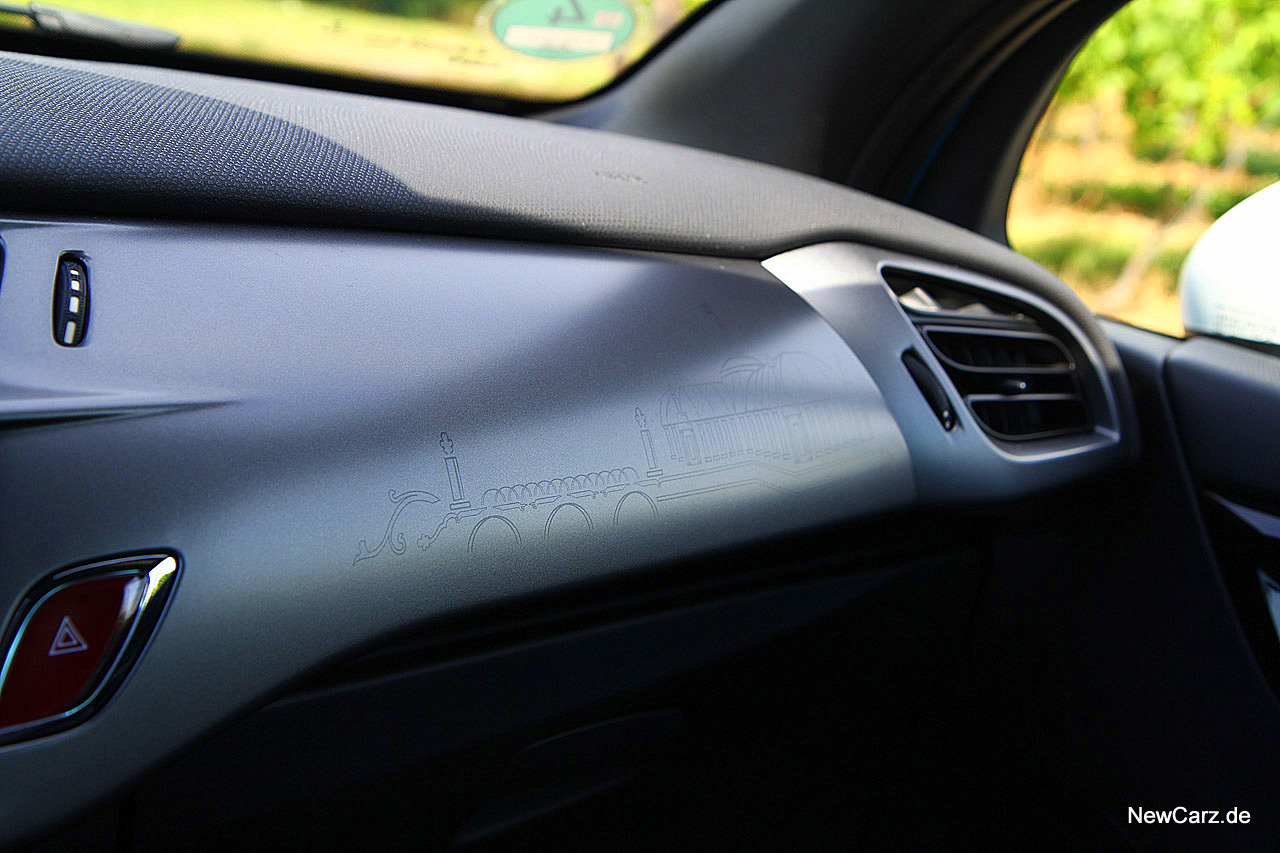 Der Armaturenträger trägt eine Kunststoffverarbeitung, welche entfernt an die Strukturen eines Tuchstoffs erinnert und dadurch einen angenehmes Flair versprüht. Die Silhouette ‚Irrésistible Paris‘ wurde rechts über dem Handschuhfach auf die mondstaubgraue Oberfläche gelasert.