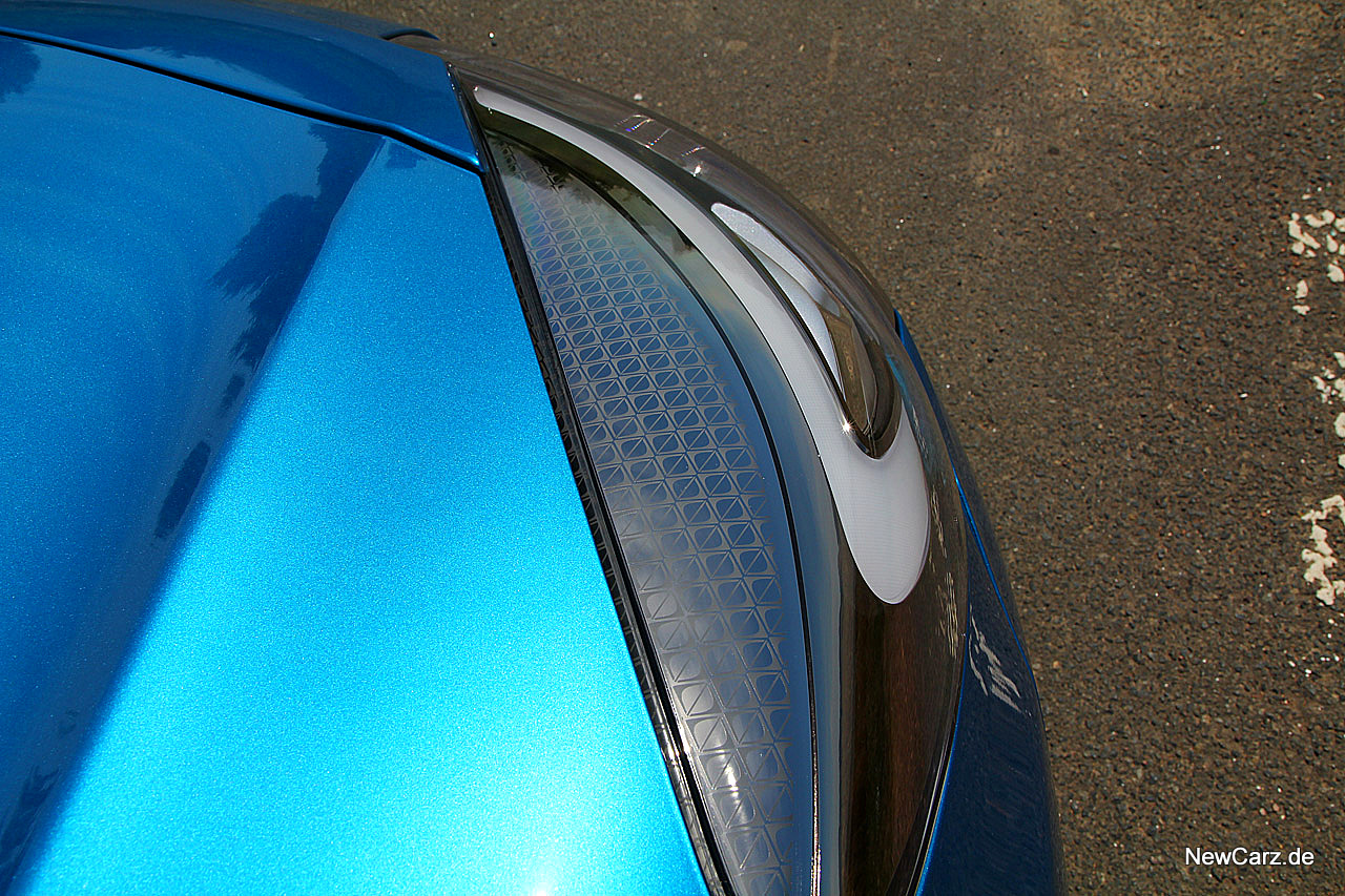 Als markantestes Detail wirkt die geteilte, optisch in sich verzahnte B-Säule im Design einer invertierten Haifischflosse, wodurch das Dach aus der seitlichen Perspektive zu schweben scheint. Aufgrund der zweifarbigen Aufteilung verstärkt sich dieser Effekt um ein vielfaches.