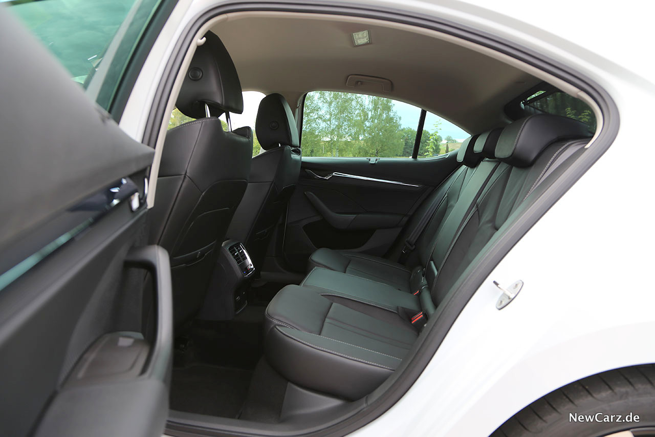 Viele Softtouch-Oberflächen und feines Dekor machen aus dem Octavia eine Limousine mit einem gewissen Premium-Anspruch, mit dem er dem größeren Bruder, dem Superb verdächtig nah auf die Pelle rückt. Das nach hinten schräg abfallende Dach mit den superbreiten C-Säulen sieht zwar richtig gut aus, schränkt allerdings die Rundumsicht massiv ein, das fiel uns ebenfalls sogleich auf. Dafür fällt die Kopffreiheit auch im Fondbereich noch überdurchschnittlich aus – das Platzangebot ist zudem überall enorm.