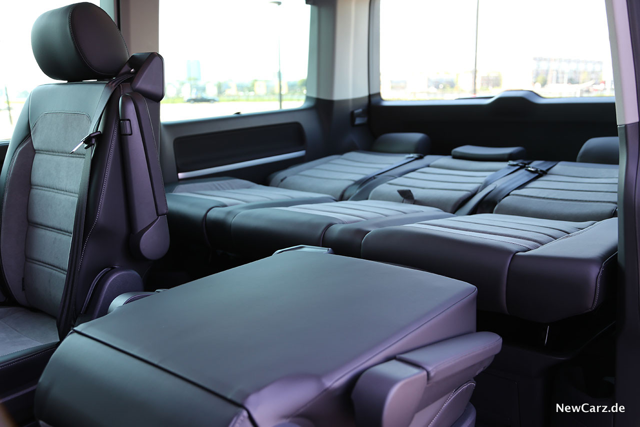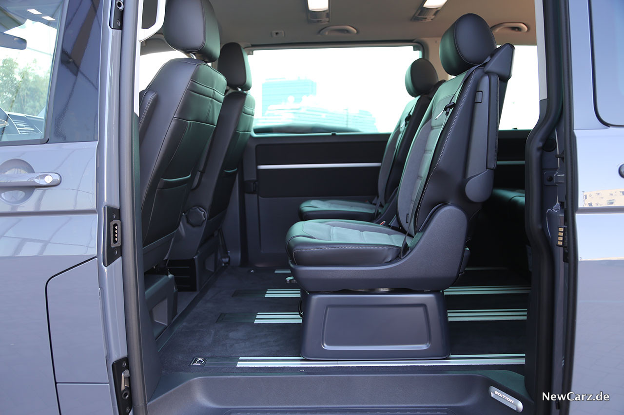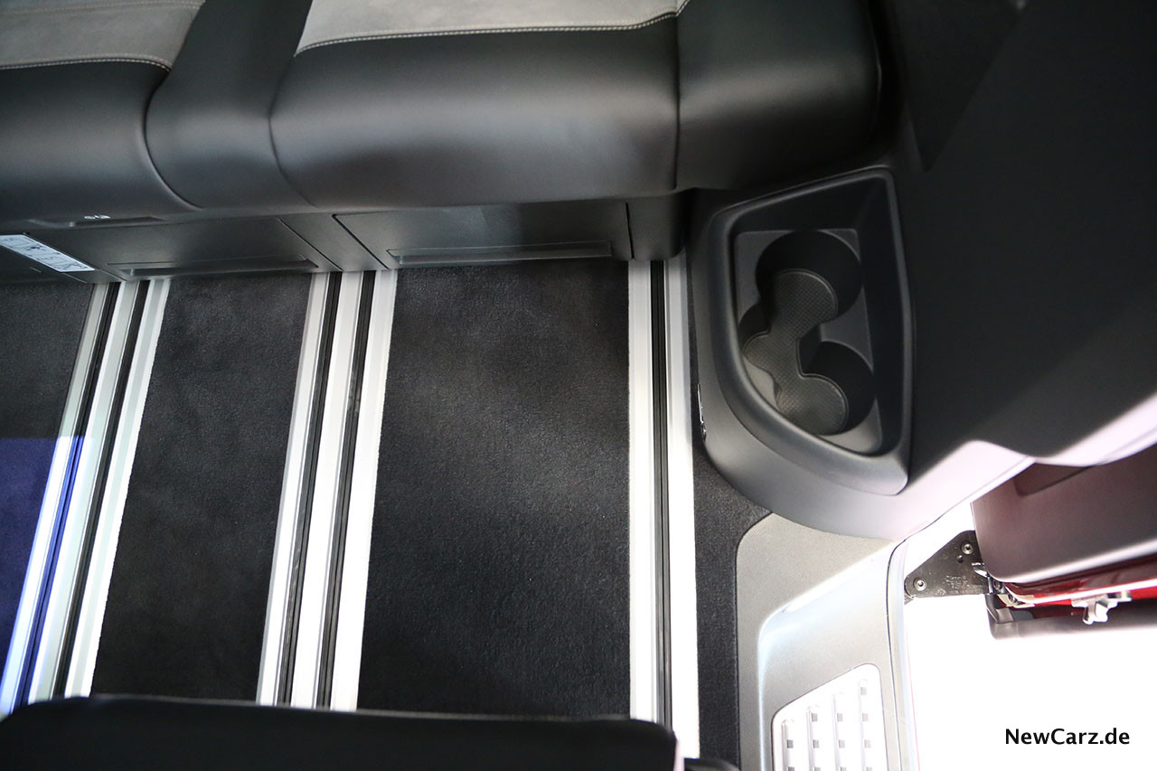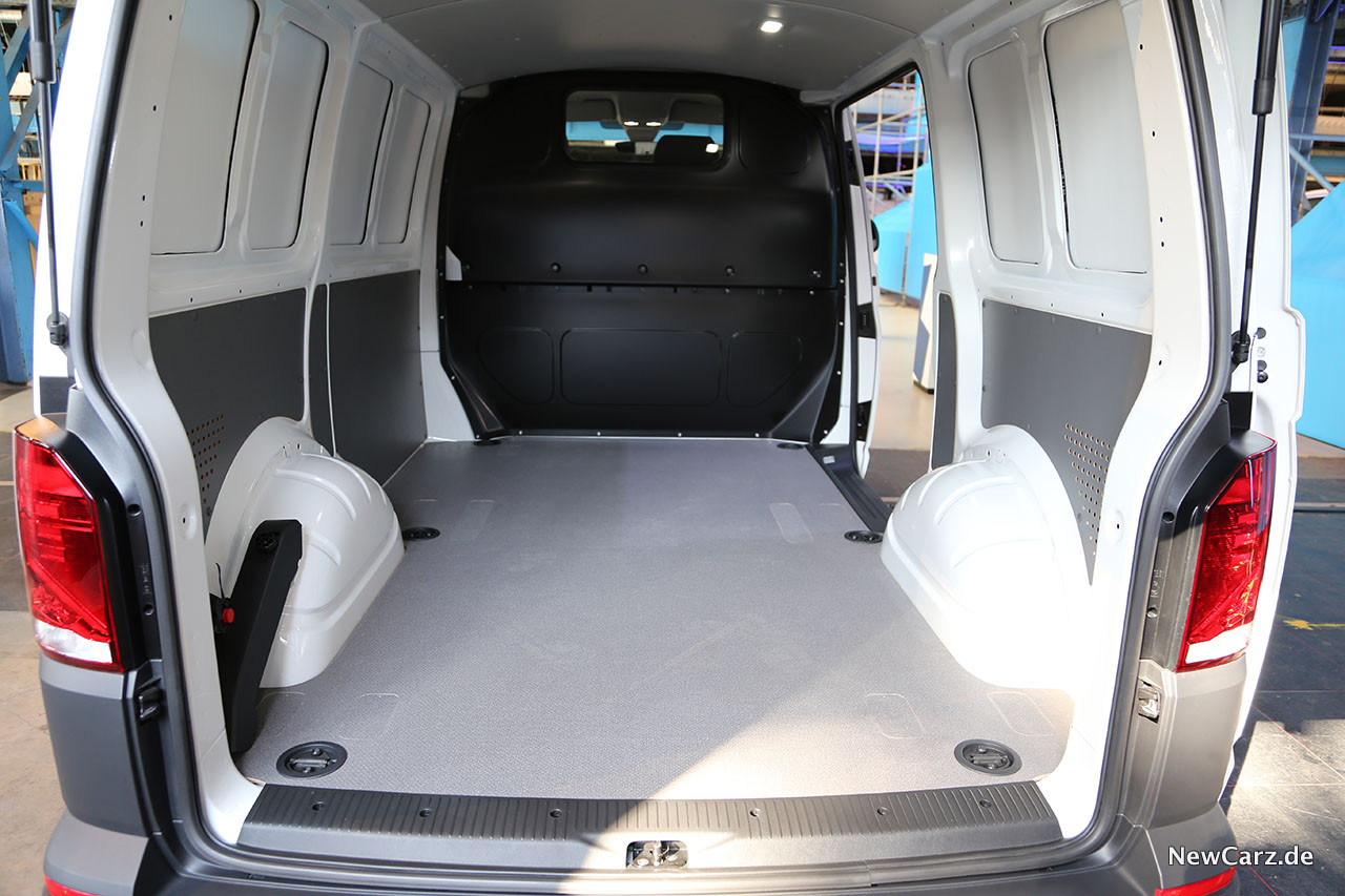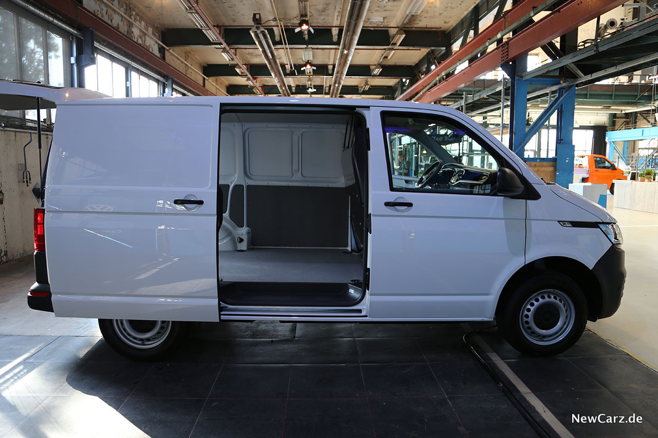 Neue Features sind darüber hinaus die 230-Volt-Steckdose am Fahrersitz und das abschließbare Fach der Doppelsitzbank auf der Beifahrerseite. Besonders langes Transportgut kann nun dank der Unterladefunktion bis unter die Beifahrerbank geschoben werden, sodass die maximale Laderaumlänge von 2.450 mm auf 2.800 mm respektive von 2.900 mm auf 3.300 mm beim Bulli 6.1 mit verlängertem Radstand steigt.