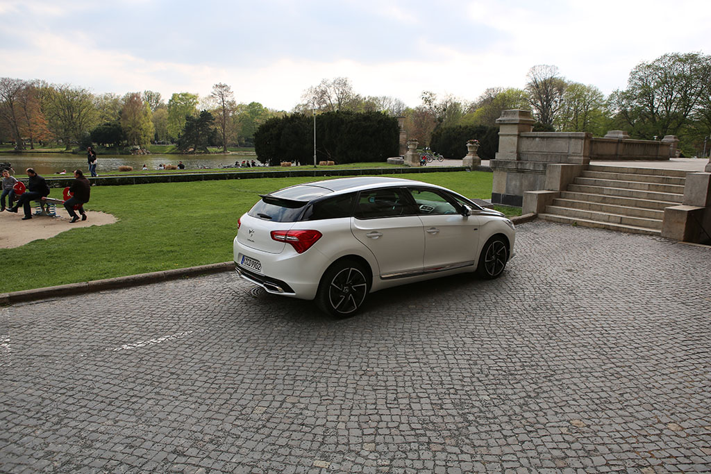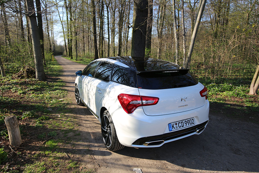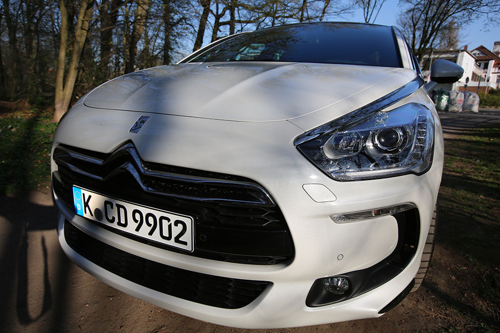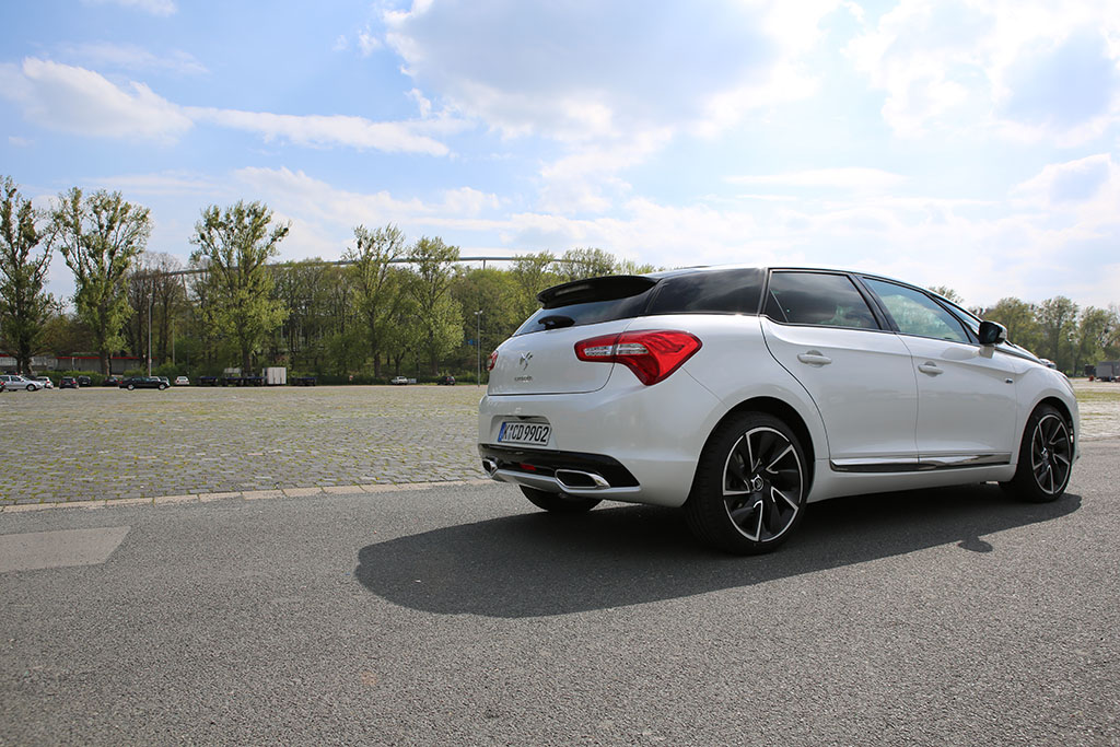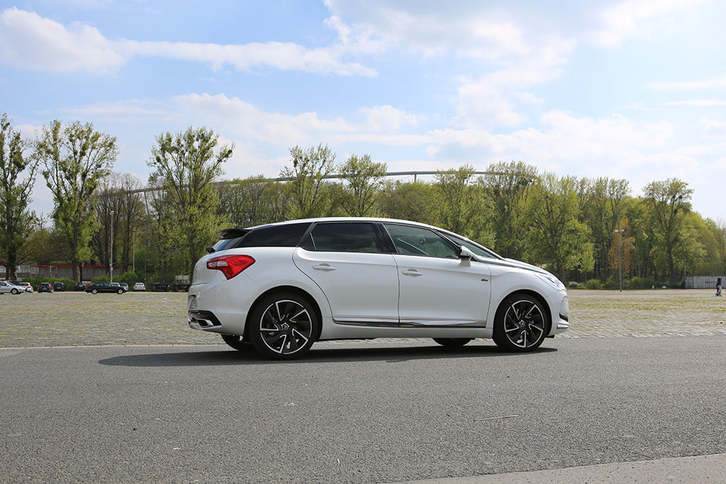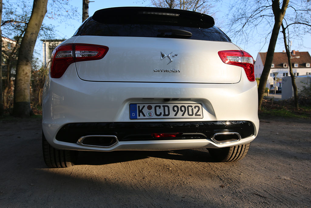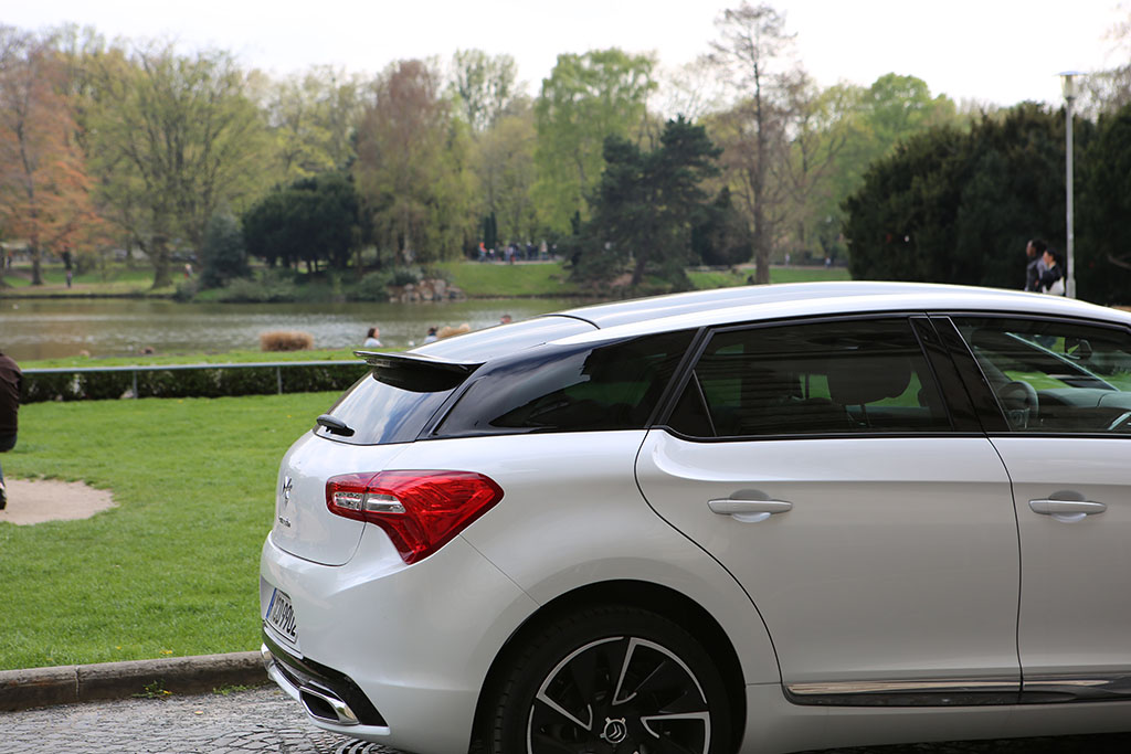 Fährt der Citroën DS5 an einem vorbei, so folgt das Auge dem Gefährt für einen Moment. Warum? Das Design ist ungewöhnlich, extravagant, innovativ. Das Auto sieht auf den ersten Blick schick aus, wie eine knuffige Familienkutsche. Das historische Element der DS-Reihe übernimmt auch der Citroën DS5. An der Seite sind linienförmige Elemente und die Dachlinie ist ebenfalls in einem Zug gezeichnet. An der Front erwarten einen etwas langgezogene Scheinwerfer, was jedoch insgesamt gut zum Design passt. Am Heck entdeckt man neben einem kleinen Spoiler auf der Heckscheibe (dazu später mehr), ziemlich ungewöhnlich gewölbte Rückleuchten. Dazu kommen die sehr schicken Felgen.