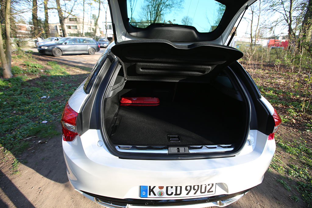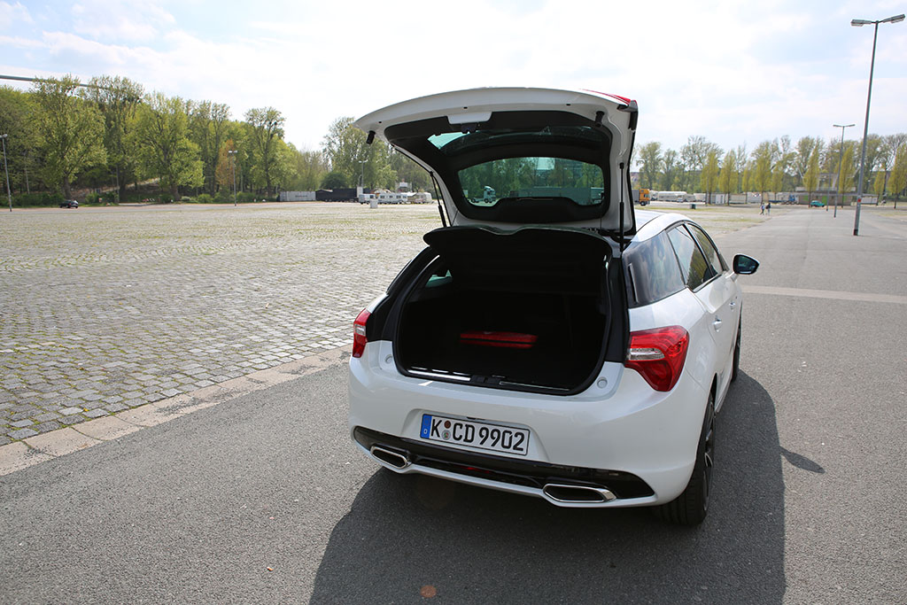 Etwas schade ist, dass man zum Öffnen des Kofferraums immer zum Autoschlüssel des Citroën DS5 greifen muss – eine Kofferraumöffnung sucht man vergeben. Das Volumen des Kofferraums bietet genügend Platz für den ein oder anderen Familien-Einkauf. Das Problem ist eher die extrem hohe Ladekante, welche ein wenig störend auffällt.