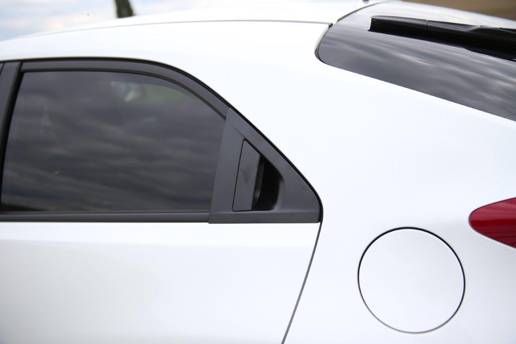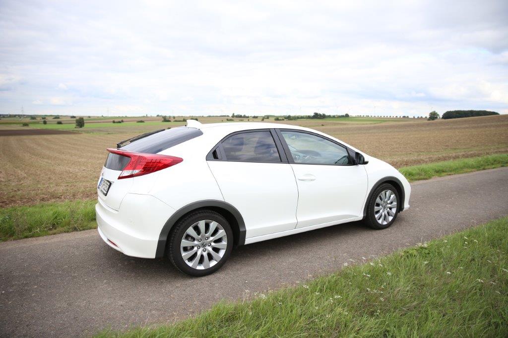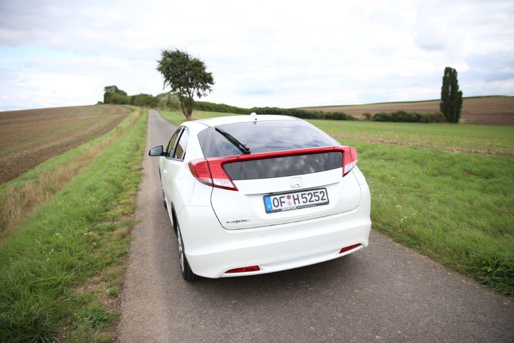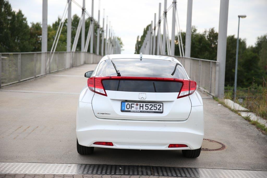Das Heck des Civic ist – diplomatisch ausgedrückt – extravagant. Die hohe Hecklinie, die durch eine ungewöhnliche Positionierung der Heckscheinwerfer erreicht wird, erinnert an den BMW X6. Der Honda besitzt ebenfalls eine extrem flache Heckscheibe, die allerdings noch unter der der Rückleuchte fortgesetzt wird und somit in zwei Teile gespalten ist. Überflüssig zu erwähnen, dass die Sicht nach hinten ein Graus ist und die Auswahl einer Rückfahrkamera zur Pflichtübung wird.