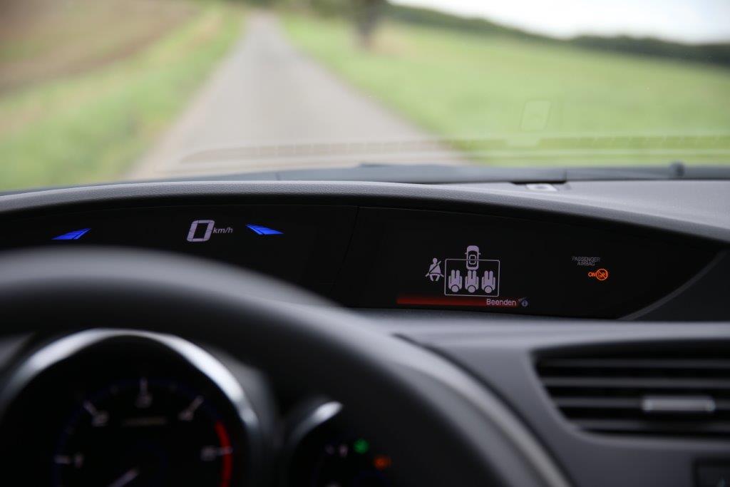 Die Motorhaube verläuft recht steil, was zwar zu einer geduckten, aggressiven Optik beiträgt, dem Fahrer aber beim einparken jegliches Gefühl für die Länge des Fahrzeugs nimmt. Gut, dass Honda dem Civic auch an der Front Abstandswarner spendiert hat.
