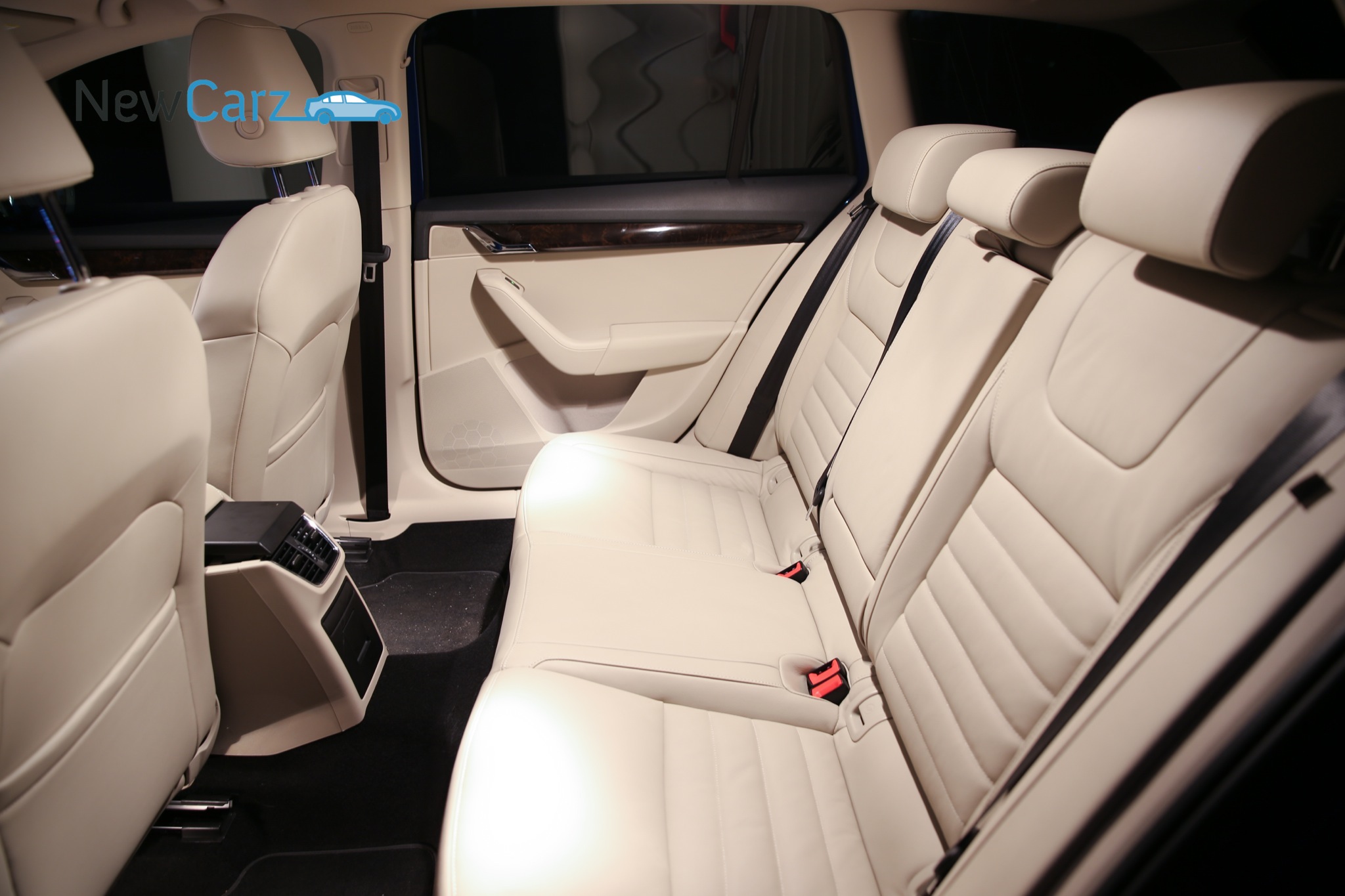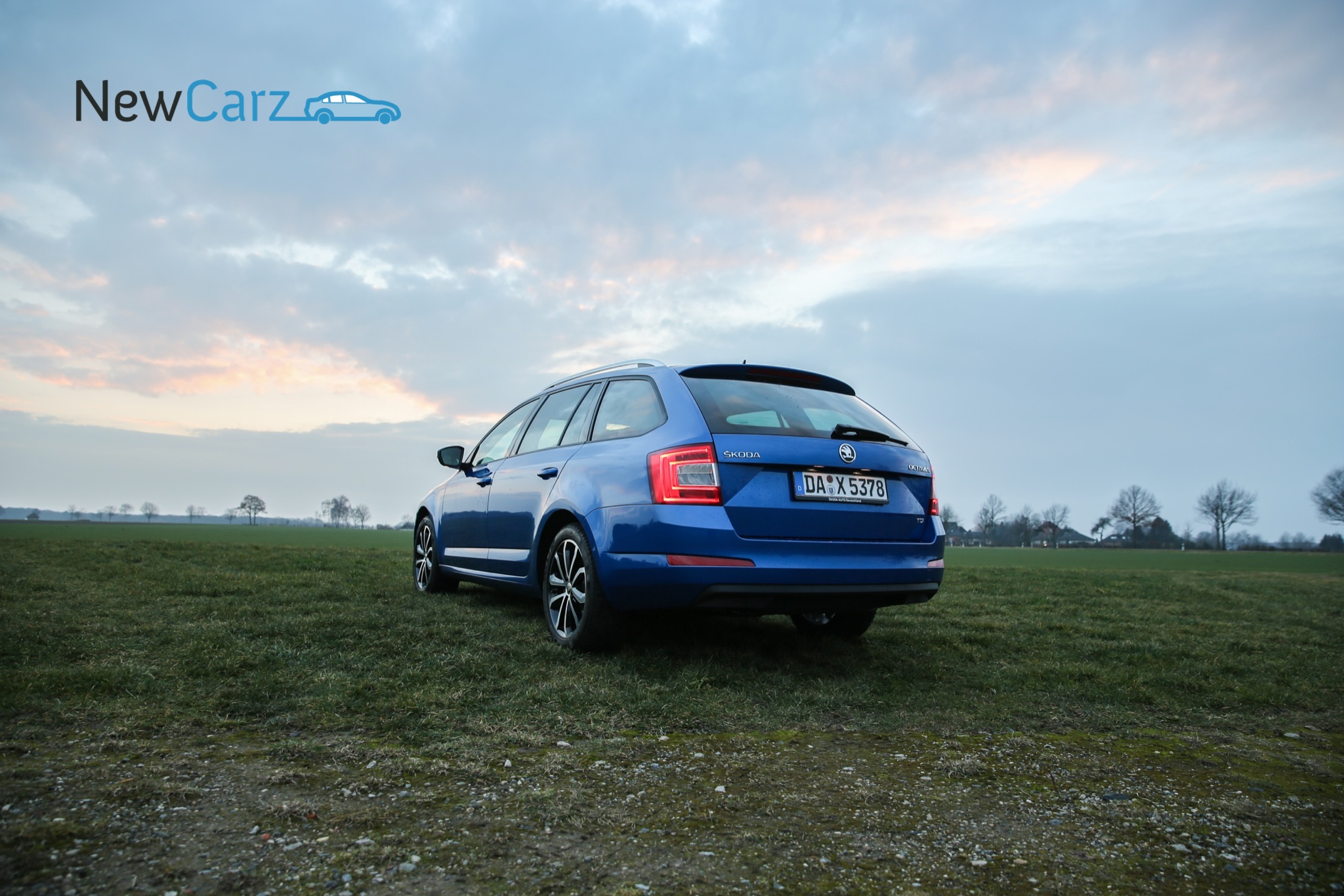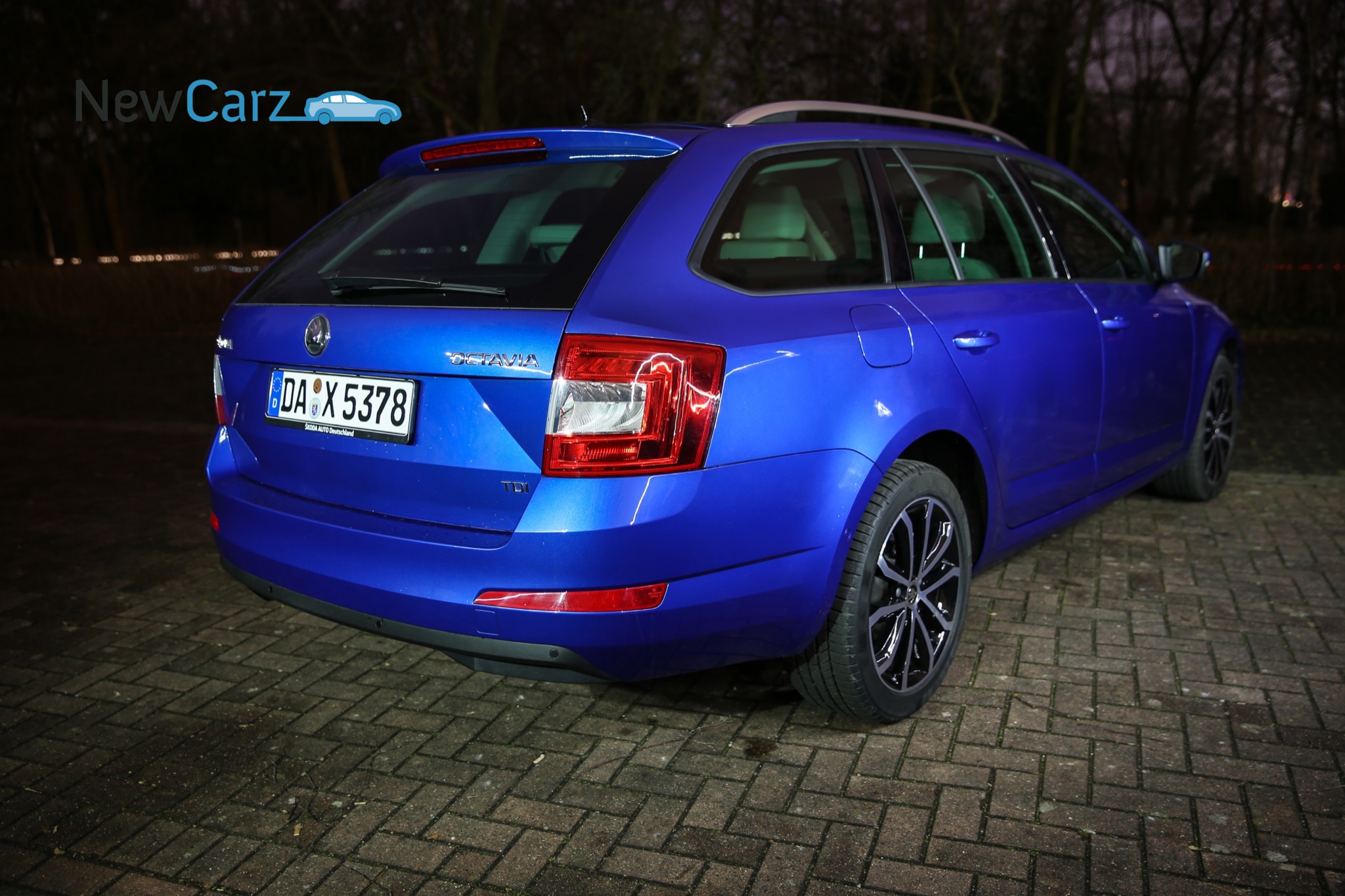 Am Heck erwartet den Betrachter eine große Heckklappe mit einer Nummernschildaufnahme, die von zwei seitlich-diagonalen Einzügen umrahmt ist – ein Stilelement, das sich mittlerweile durch das gesamte Kombi-Portfolio Skodas zieht. Hier kommen auch die – typisch für Skoda – c-förmigen Rückleuchten zum Tragen. Nicht nur das Design am Tage ist hier als rotes „C“ zu interpretieren, sondern auch bei Nacht illuminiert und als solches zu erkennen: Das sorgt für Wiedererkennungswert. Zusammen mit dem sehr schön integrierten kleinen Dachspoiler ergibt sich so ein sportlicher Abgang, der leider nicht von einem sichtbaren Auspuffrohr gekrönt wird.