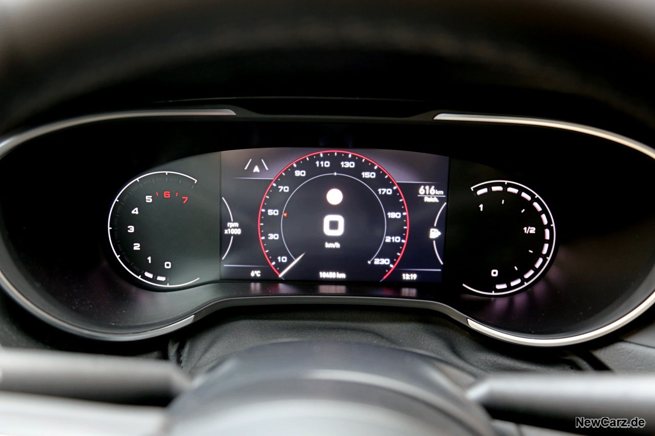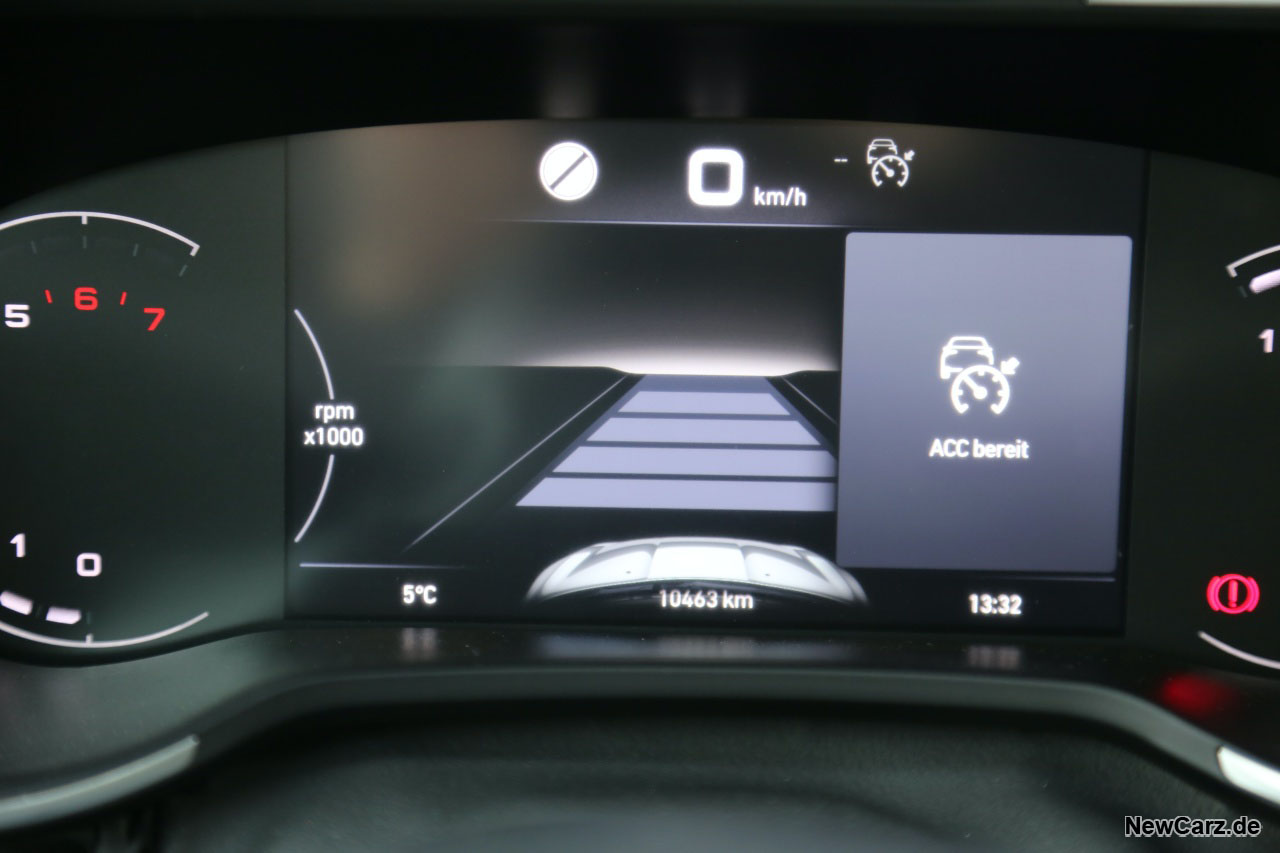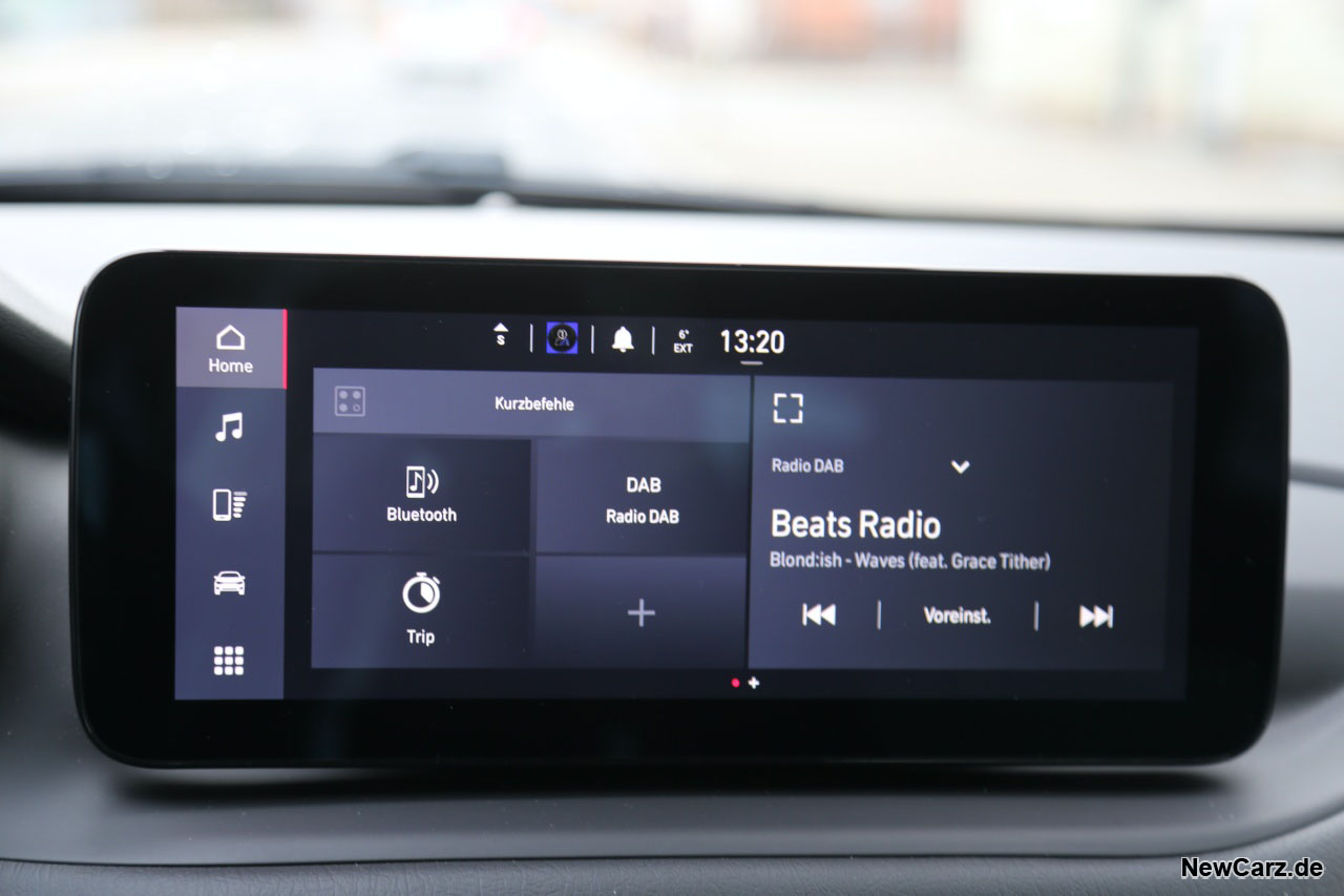 Im Innenraum des Testwagens hielt der digitale Frühling Einzug: Als Zentralbildschirm fungiert ein 10.25-Zoll-Touchscreen, der aufgesetzt in der Mitte des Armaturenbereichs thront und mit guter Auflösung aufwarten kann. Das digitale Cockpit kann dahingehend zwar nicht ganz mithalten, bietet aber zahlreiche Anzeigeoptionen und fügt sich bestens in die beiden LED-Anzeigen links und rechts davon ein.