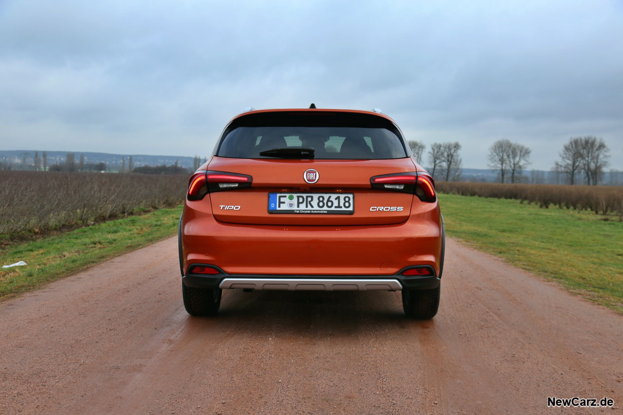 Am Heck angekommen, zeigt sich zuerst die neue, filigran gezeichnete LED-Signatur der überarbeiteten Rückleuchten und ein weiterer Unterfahrschutz rundet das Gesamtbild des Crossover gekonnt ab. Endrohrblenden sucht man derweil vergebens – man verzichtete im Fall des Fiat Tipo Cross darauf.