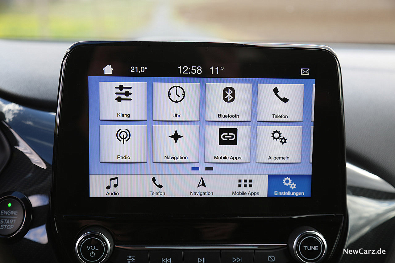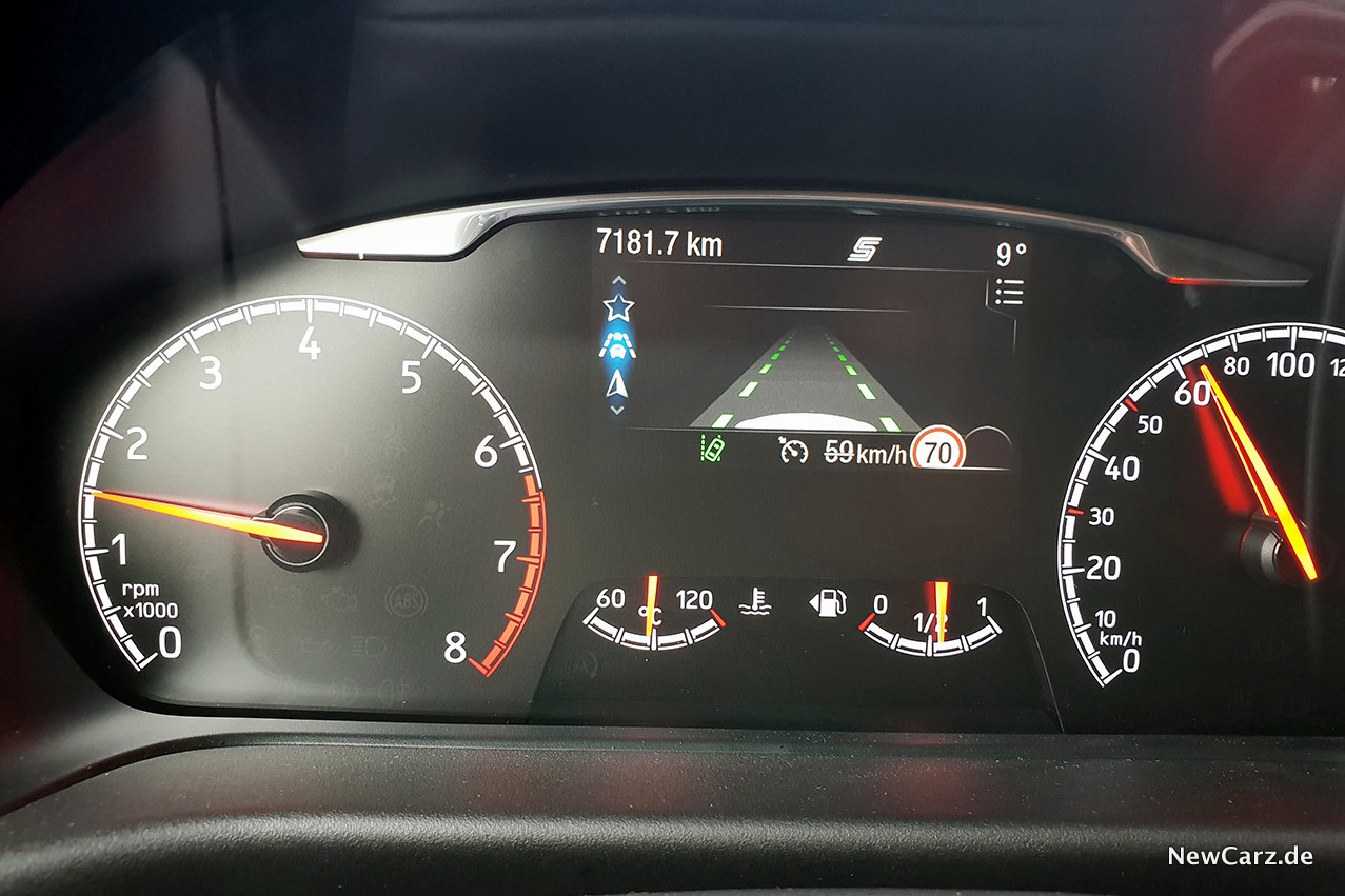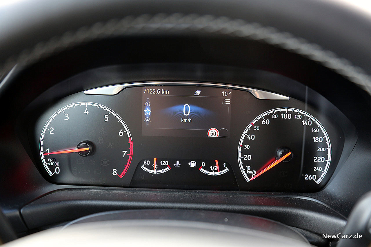 Das Infotainmentsystem mit zentral angeordnetem Touchscreen entspricht dem eines typischen Fords. Informativ, zwar etwas einfarbig, dafür aber nach kurzer Auseinandersetzung mit der Menüführung klar verständlich und leicht bedienbar. Das Kombiinstrument besteht aus klassischen, analogen Rundinstrumenten mit einem mittig platzierten Multiinfodisplay, über das sowohl Fahr- und Fahrzeugdaten als auch die Pfeilnavigation aufgerufen werden kann.