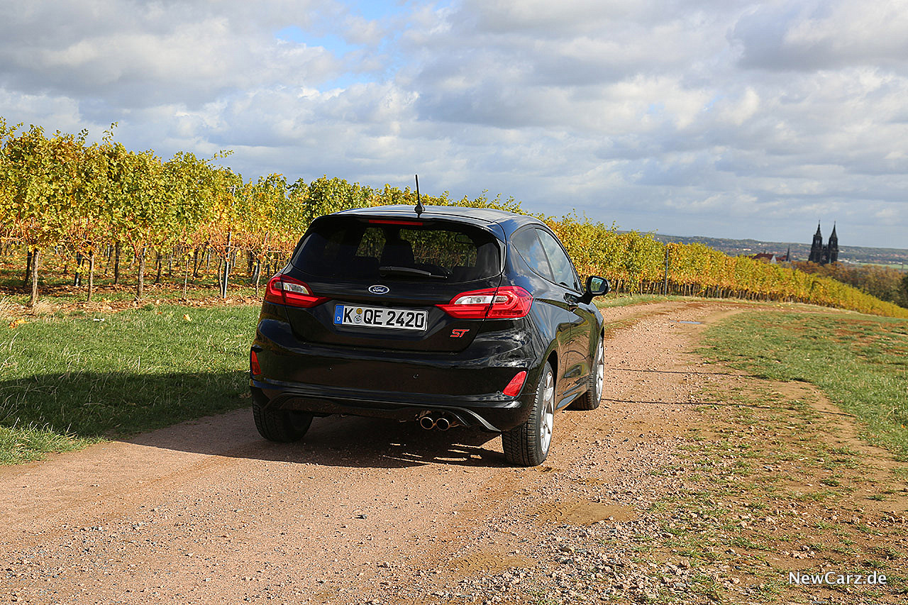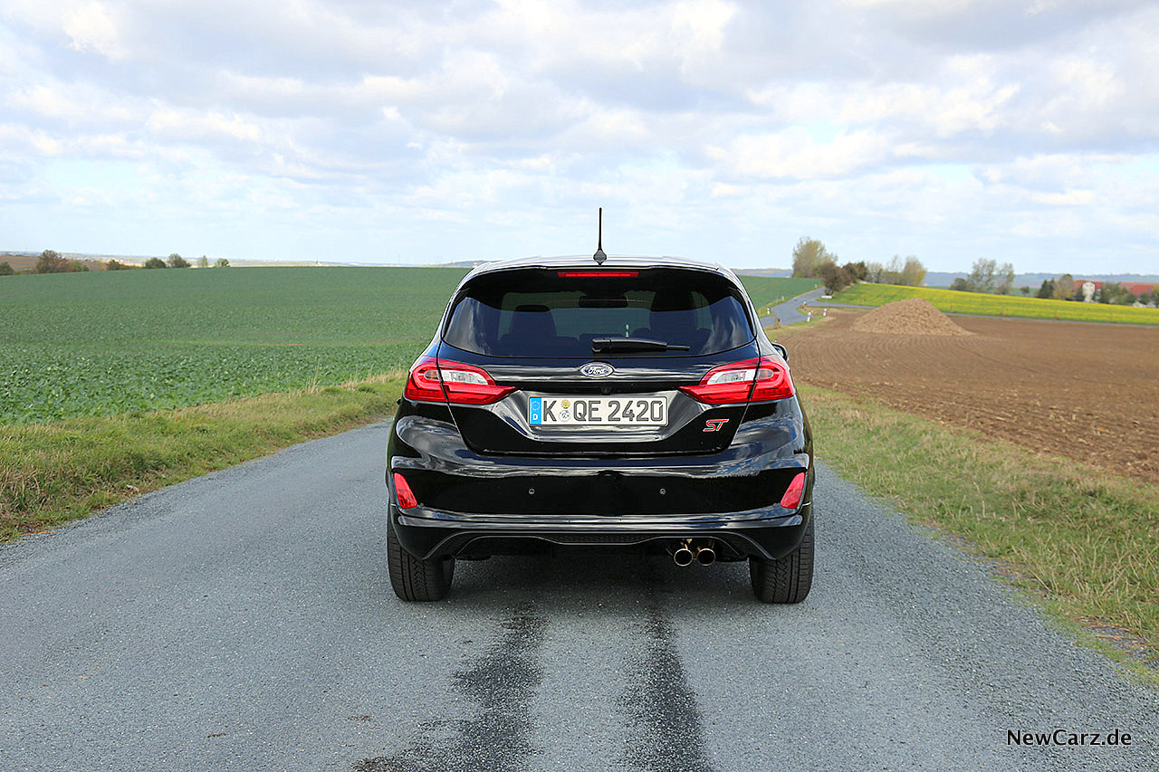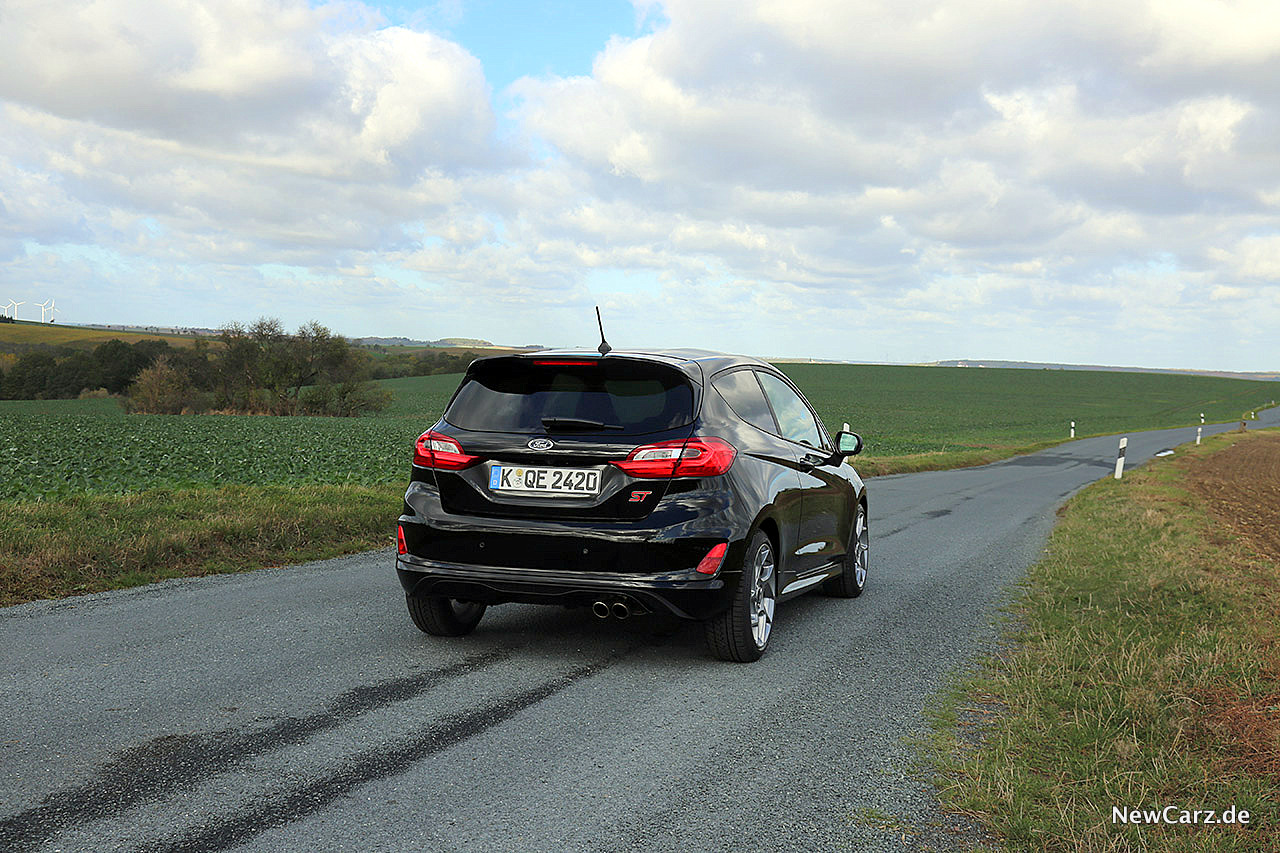 Zwar zeigt der ST auch rote Bremssättel hinter ansehnlichen 17-Zöllern und ein Dachkantenspoiler stellt mit einem – übrigens echten – doppelten Abgasendrohr das Finish am Heck des Kleinwagens dar, doch so richtig sportlich wirkt das noch nicht auf den geneigten Betrachter. Hier vermutet man keineswegs, was in diesem Fiesta für eine temperamentvolle Seele schlummert.