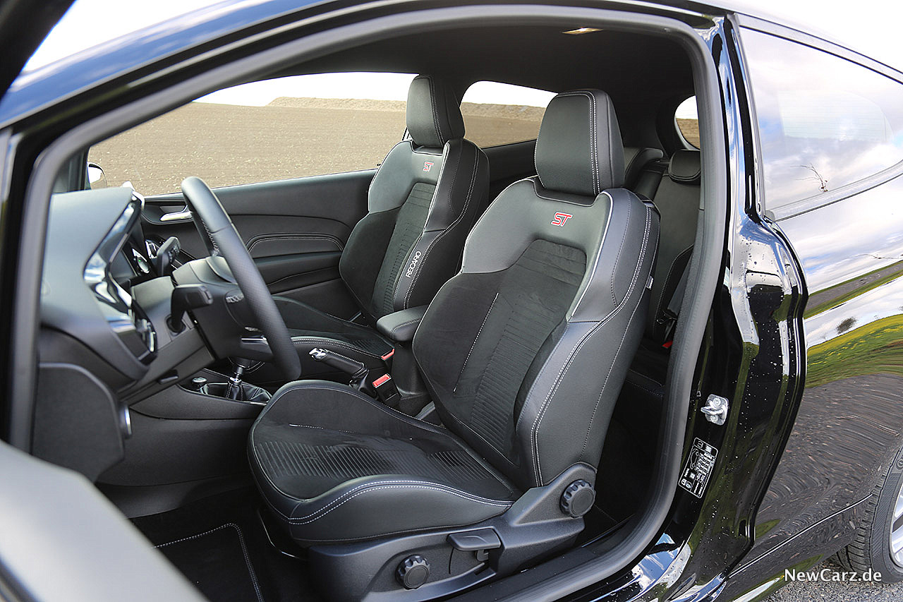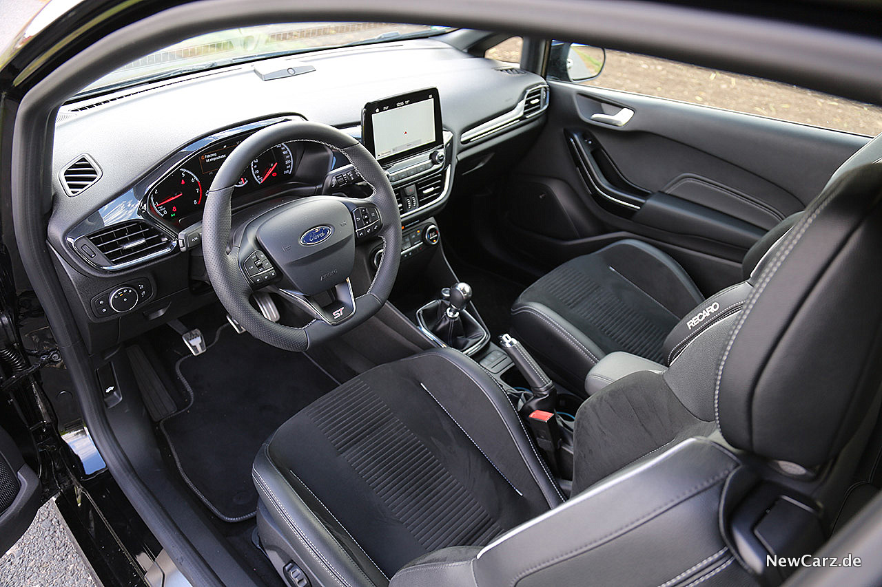 Im Innenraum herrscht eine Ford-typische Designlinie mit vielen bekannten Elementen, wie beispielsweise aus dem Ford EcoSport. Auf die Insassen warten straff gepolsterte und gut konturierte Recaro Sportsitze mit ausgeprägtem Seitenhalt. Fast plüschig wirkendes Alcantara auf den Sitzflächen und den Rückenlehnen sieht nicht nur gut aus, sondern fühlt sich auch sehr geschmeidig an – hier fühlt man sich auf Anhieb wohl.