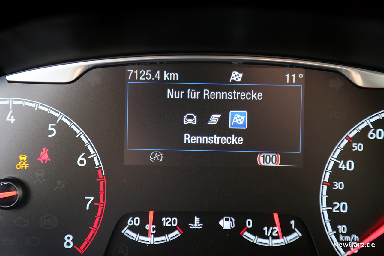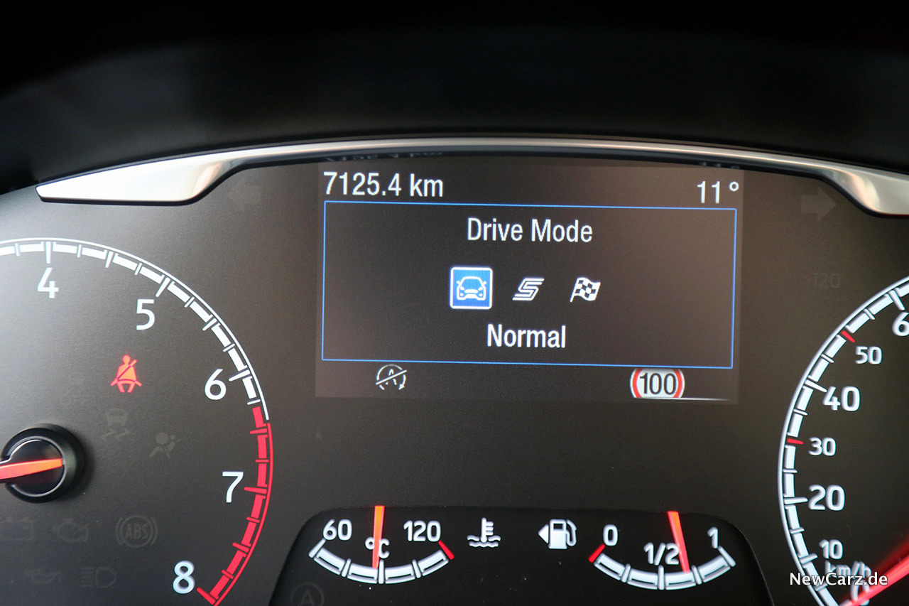 Dabei zeigt sich das Fahrwerk durchweg sportlich bis rennstreckenkonform. Die Fahrmodi Normal, Sport und Rennstrecke – also hart, härter und knüppelhart – zollen der Lebhaftigkeit und Direktheit Tribut, sodass der Ford Fiesta ST auf der Langstrecke gewisse Einbußen im Komfort verzeichnen muss.
