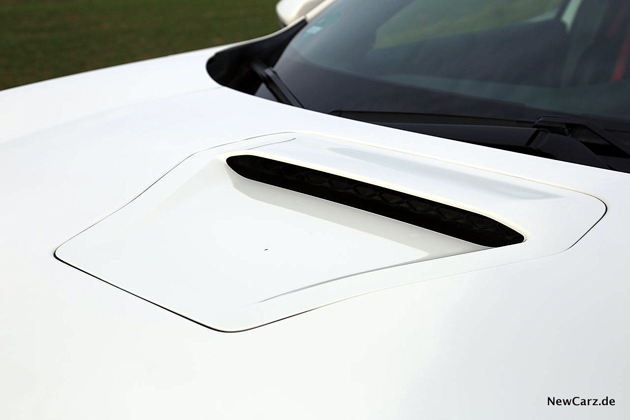 Die böse dreinblickende Front dominiert mit den flach gehaltenen Voll-LED-Scheinwerfern, die aufgrund der Spiegelreflektoren eine spacige Optik ausstrahlen. Mit dem Frontspoiler aus Carbon und der Hutze auf der Motorhaube stellt der Japaner seine potenten Fähigkeiten bereits massiv zur Schau.