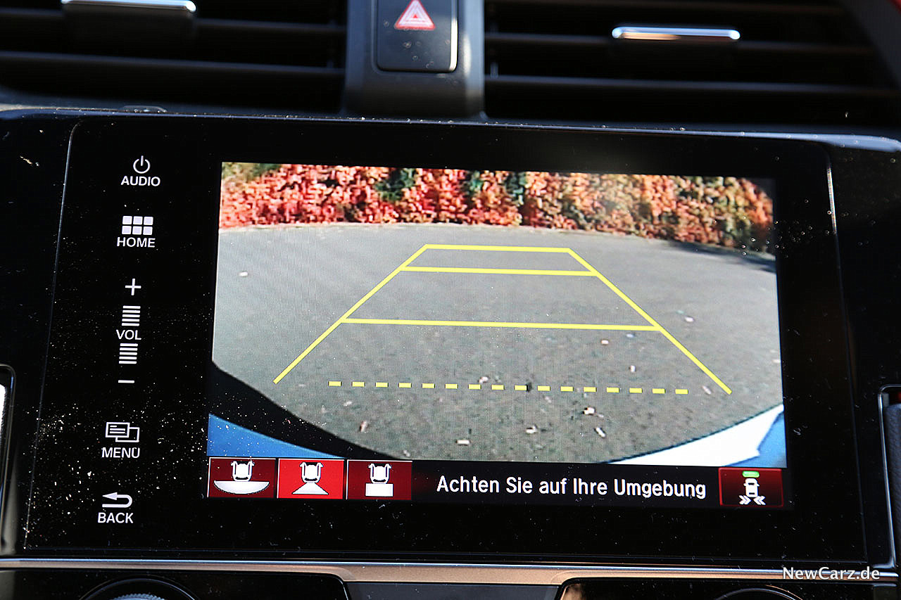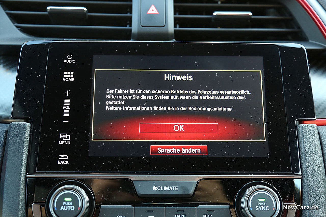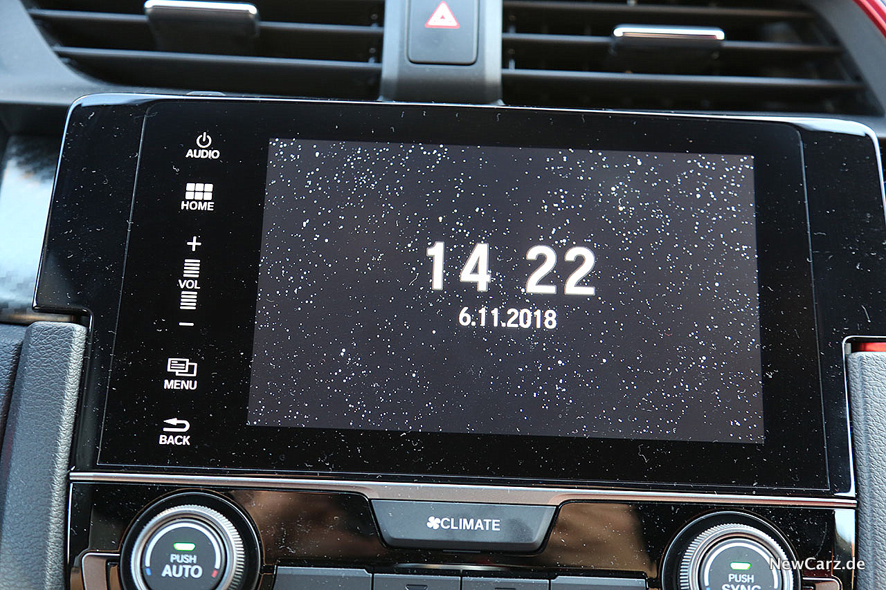 Das Infotainmentsystem mit dem zentralen Bildschirm verlangt bedientechnisch zunächst etwas Aufmerksamkeit, was uns auch im herkömmlichen Civic bereits auffiel. Hat man sich dann allerdings eingewöhnt, gibt es keine Fragen mehr.