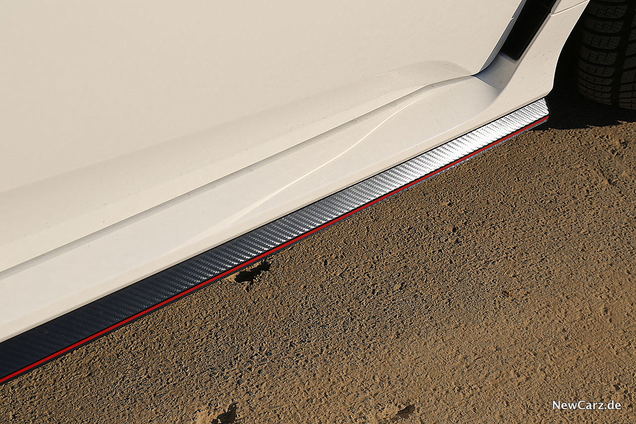 Auch seitlich betrachtet weist die ansteigende Fenstergrafik auf eine lauernde und zeitgleich absprungbereite Haltung hin, die von den ebenso in Carbon gehaltenen Schwellerspoilern sowie den 20 Zoll großen Rädern und den markanten Bremssätteln untermauert wird. Seitliche Begrenzungsleuchten sorgen zudem für einen fast exotisch anmutenden Touch.
