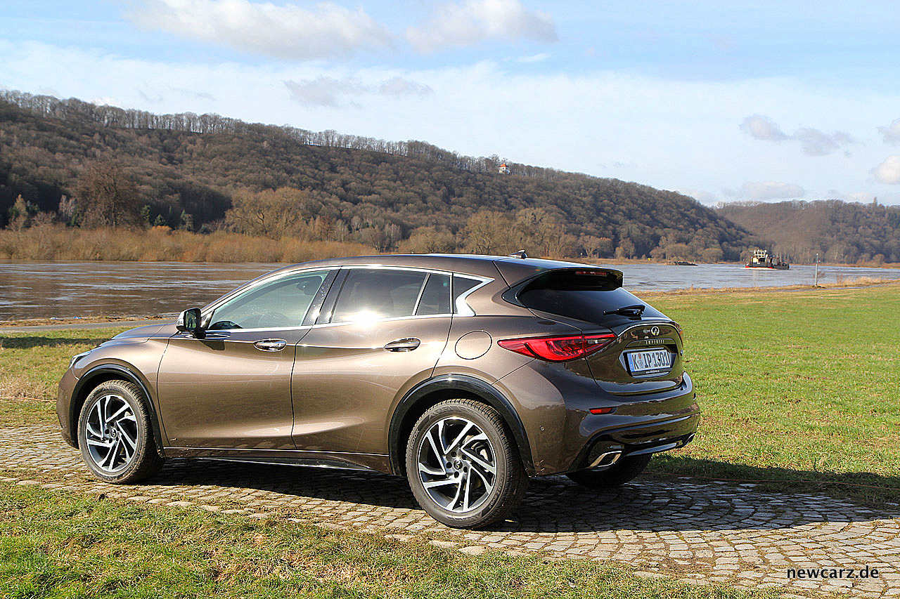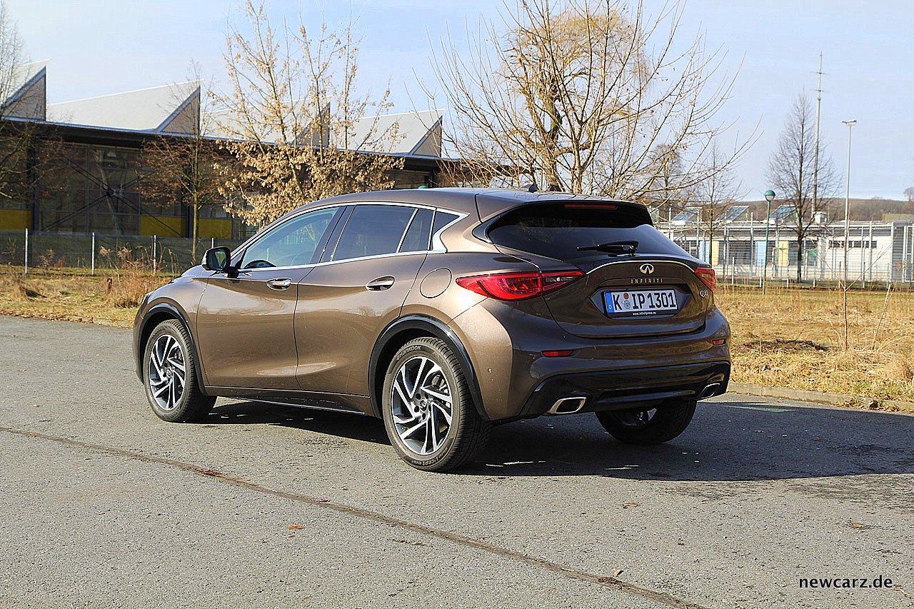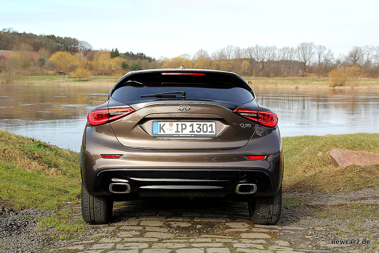 Am Heck zeugen moderne LED-Schlussleuchten und eine zweiflutige Abgasanlage mit verchromten Endrohren für eine sportlich dezente Note. Der angedeutete Heckdiffusor in schwarzer Klavierlackoptik dient zudem als Fingerzeig auf den Anspruch zur Hochwertigkeit. Vor allem hier wird der insgesamt etwas höhere Aufbau des Q30 sehr deutlich.