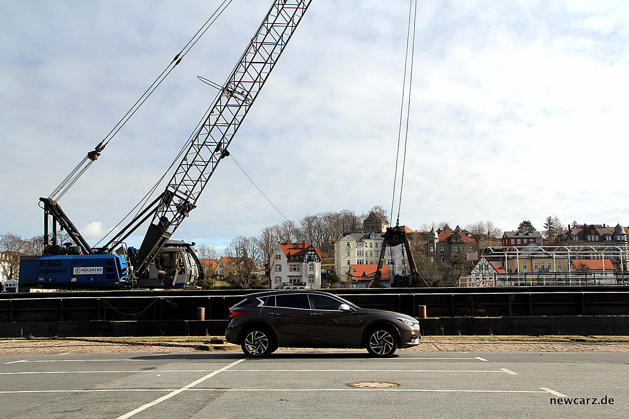 Das Fahrverhalten des Q30 zeigt sich mit komfortorientierter Charakteristik. Fahrbahnunebenheiten kaschiert der Kleine dabei gekonnt und lässt nur wirklich grobe Verwerfungen bis zu den Insassen vordringen. Erstaunlich dabei ist, dass der Infiniti auch bei zügig gefahrenen Kurven nicht zur Hollywoodschaukel mutiert – er neigt sich zwar dabei dem Kurvenäußeren, aber nicht in magengrubensensiblen Winkeln.