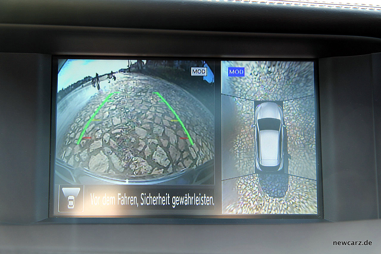 Die Rangierhilfe in Form der vier Kameras sorgen beim Rückwärtsfahren für eine 360-Grad-Rundumsicht und zusätzlich den uneingeschränkten Blick nach hinten. Legt man beim Rangiervorgang einen Vorwärtsgang ein, wechselt die Kameraperspektive automatisch auf die Frontkamera. Allerdings funktionierte während unseres Tests dieser Switch nicht immer.