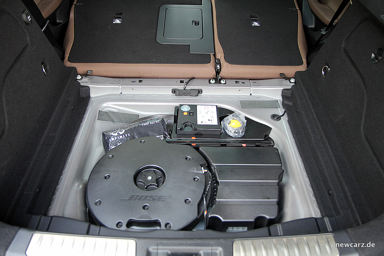 Das im Testwagen befindliche, optionale Bose Soundsystem besticht mit einem sehr guten, voluminösen und ausgewogenen Klangcharakter. Vor allem bei digitalem Radio kitzelt das System weitere, bis dahin ungeahnte Reserven hervor, die das Musikhören zur Freude machen. Das Bassgefüge untermauert ein Woofer, welcher den Platz einnimmt, der normalerweise für ein Ersatzrad gedacht war.