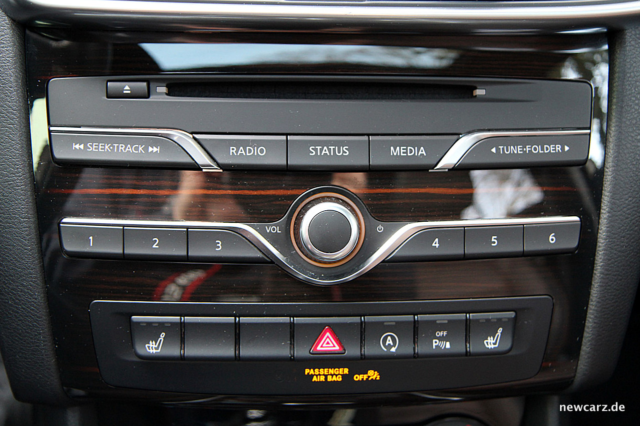 Vor allem im Dunkeln beginnt spätestens jetzt eine – während der Fahrt nicht durchführbare – Suche nach der Wischersteuerung. Fündig wird der bei Niederschlag sichtbegehrende Fahrer letztendlich am Blinkerhebel, der an seinem Ende den Drehschalter für die Scheibenwischerfunktionen versteckt. Warum diese Anordnung im Infiniti verwendet wird, darüber können wir nur mutmaßen – verstehen es allerdings nicht.