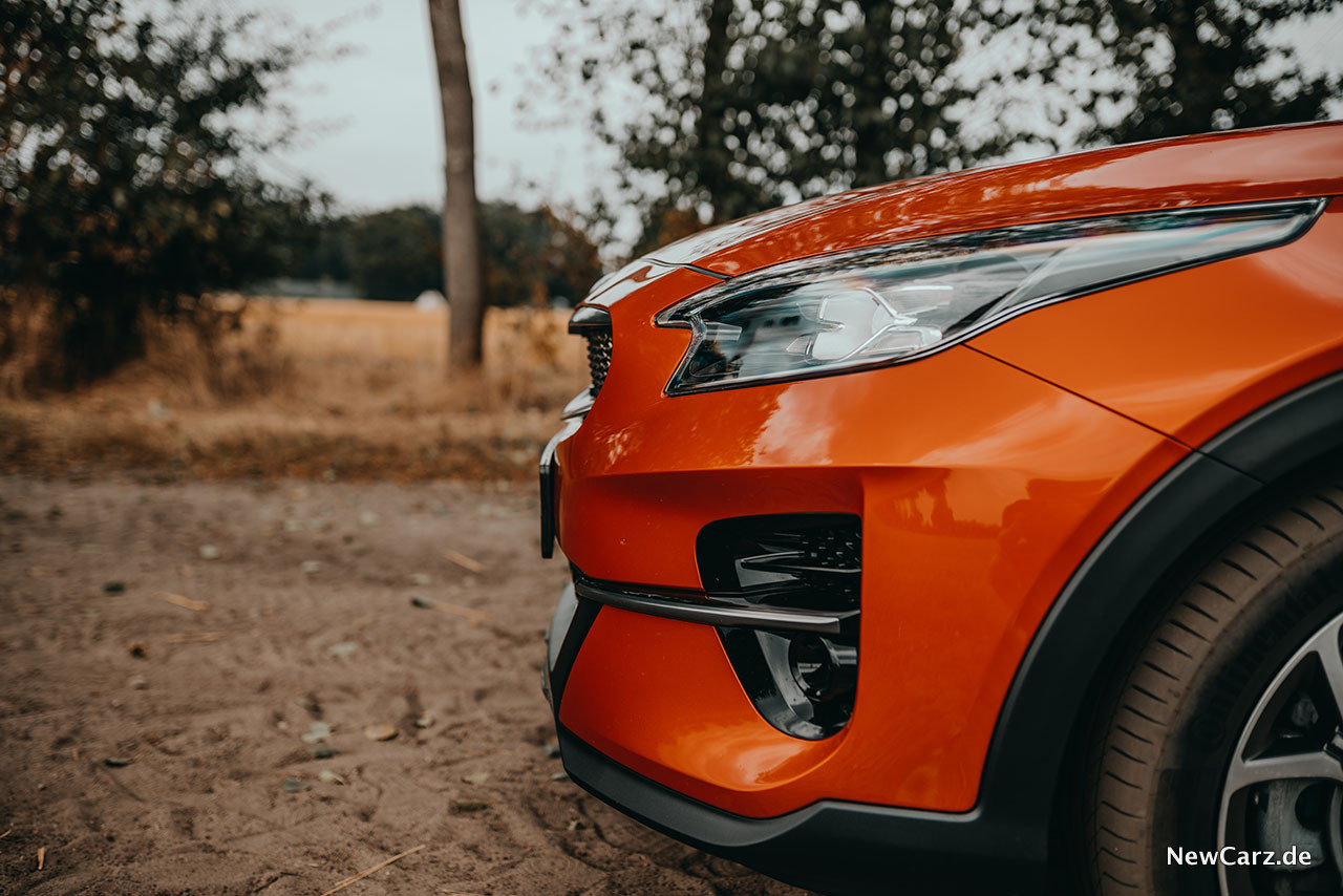 Der Kia XCeed lässt sich schon auf den ersten Blick als Kia erkennen, zeigt die typische Tigernase und die ebenso typischen vier LED-Punkte pro Scheinwerfer als Tagfahrlicht. Hübsche Details überall machen die Ansicht des Crossover-SUV aus jedem Blickwinkel interessant und zeigen auch bei diesem Modell, dass es für Europa designt wurde. Das Orange Fusion Metallic des Testwagens verleiht dem Crossover Coupé zudem eine bemerkenswert temperamentvolle Note.