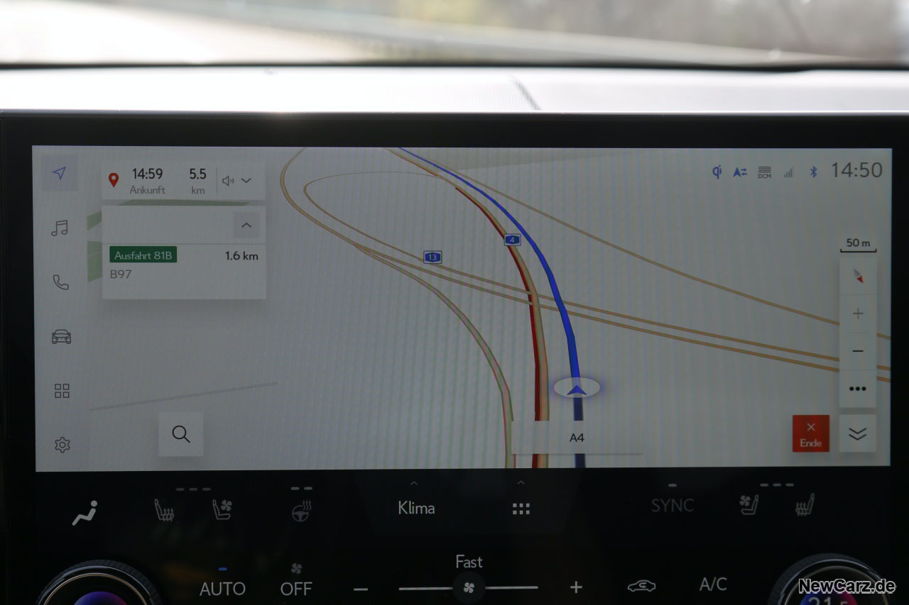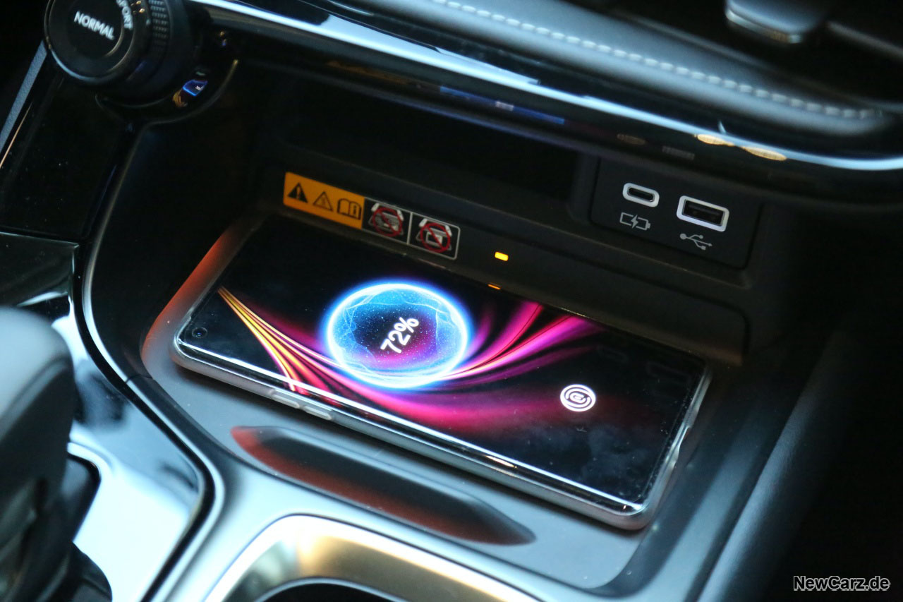 Das Infotainment ist permanent online und beinhaltet die Schnittstellen Android Auto und Apple CarPlay – beides funktioniert kabellos und einwandfrei. Apropos kabellos: Die induktive Ladestation arbeitete im Test größtenteils zuverlässig, unterbrach nur selten den Ladevorgang.