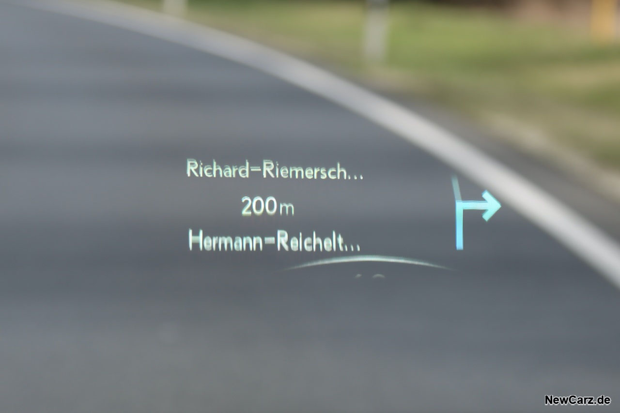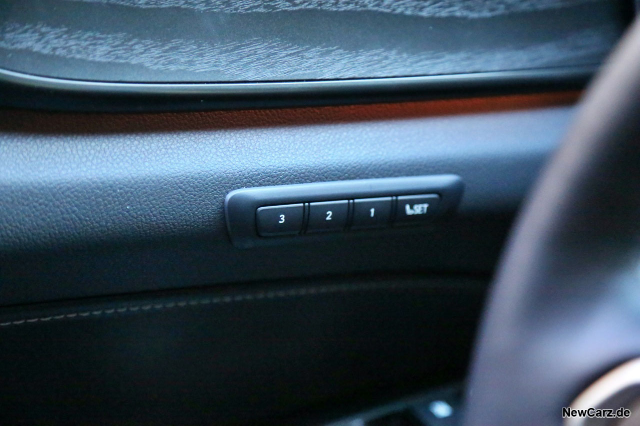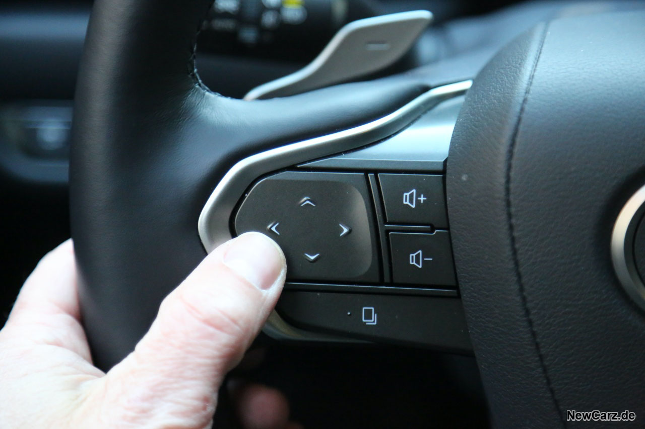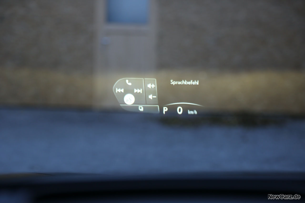Alternativ kann man sich allerdings auch über das riesige Head-up Display alle Infos anzeigen lassen. Der Clou: die Tasten am Lenkrad sind zwar konventionell, aber berührungssensitiv und werden interaktiv bei Berührung im HUD angezeigt, sodass man sofort weiß, welche Taste man soeben berührt, ohne dabei den Blick von der Straße nehmen zu müssen. Das ist innovativ und fördert die Sicherheit ungemein – Bravo! Diese berührungsempfindlichen Bedienelemente plus HUD gehören zum Luxury-Paket, zu dem wir noch genauer kommen werden.