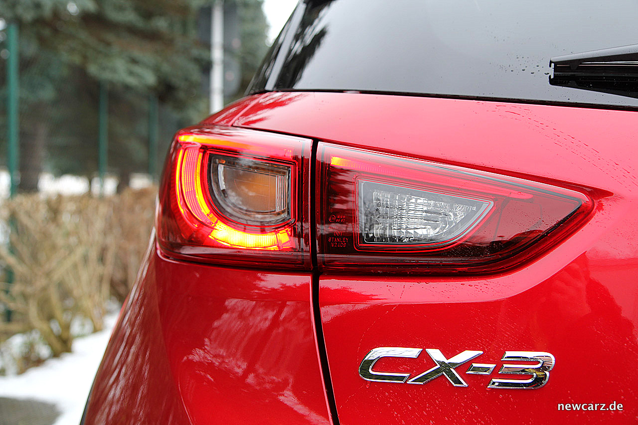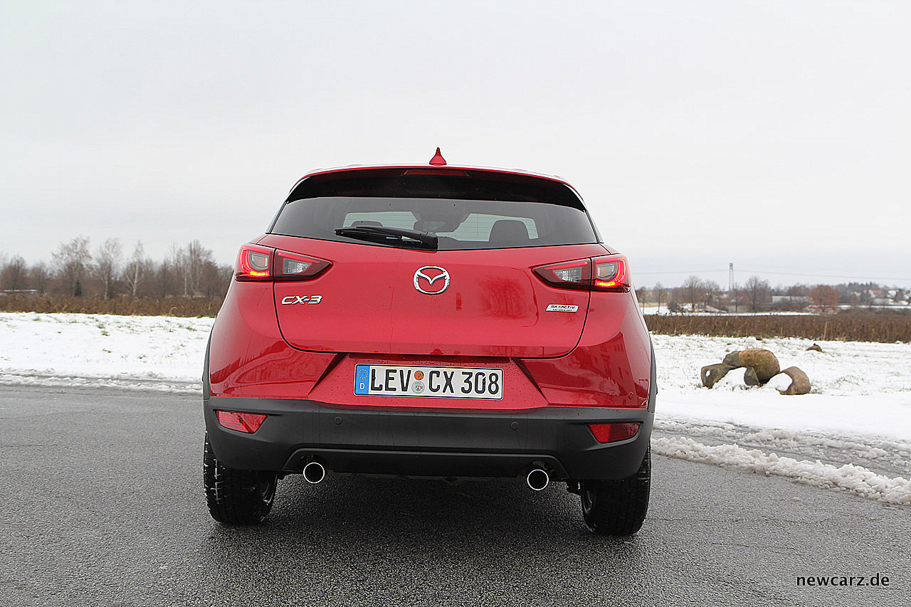 SUV-typische Beplankungen aus Kunststoff ringsum verantworten den entsprechend gewünschten Offroad-Touch. Eine schmale, trapezförmige Heckscheibe gibt durch ihre untere, im stumpfen Winkel gezeichnete Linie die Anordnungen der ebenfalls trapezförmigen Heckleuchten vor. Insgesamt wirkt der Heckabschluss des Mazda CX-3 durchtrainiert und gut definiert. Die beiden Endrohre in Edelstahl runden das Gesamtbild mit einer peppigen Note ab.