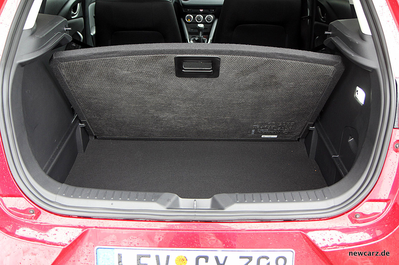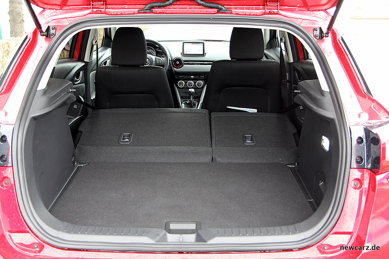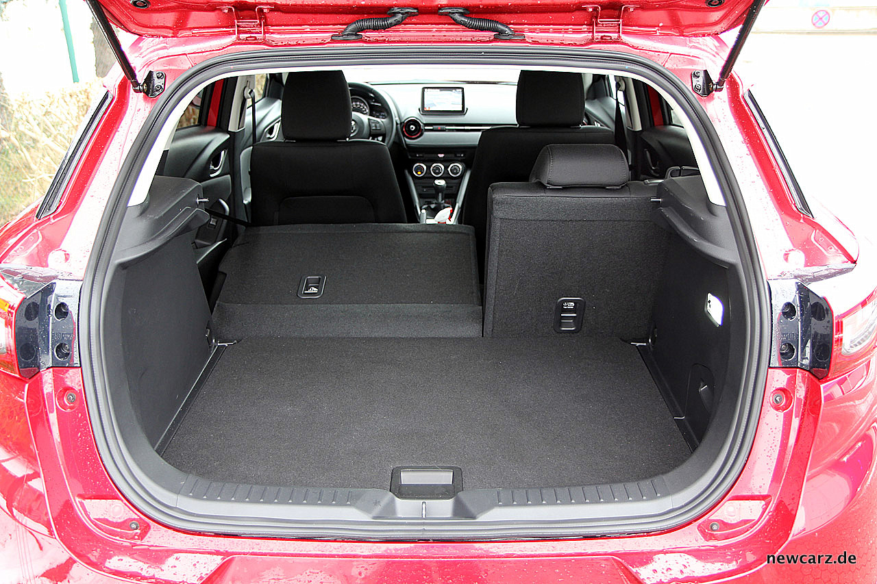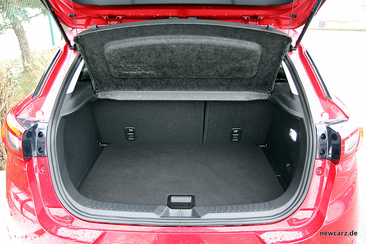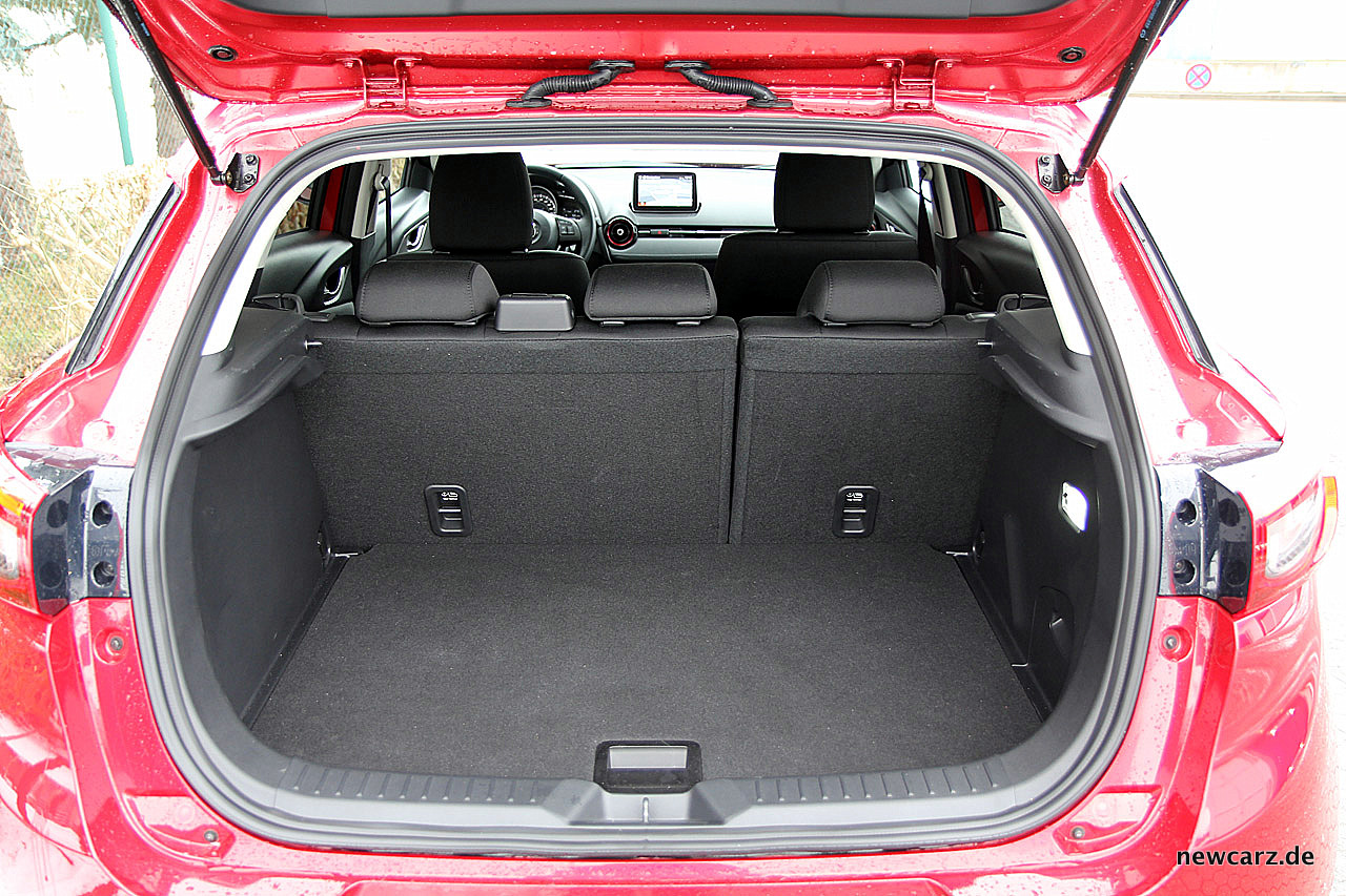 Platztechnisch zeigt sich der Mazda CX-3 auf den vorderen Plätzen nicht zurückhaltend. Auf der zweiten Reihe müssen sich groß gewachsene Passagiere mit eingeschränkter Kopffreiheit begnügen – auch ein Resultat der eleganten Designlinie mit der prägnant nach hinten abfallenden Dachkante.