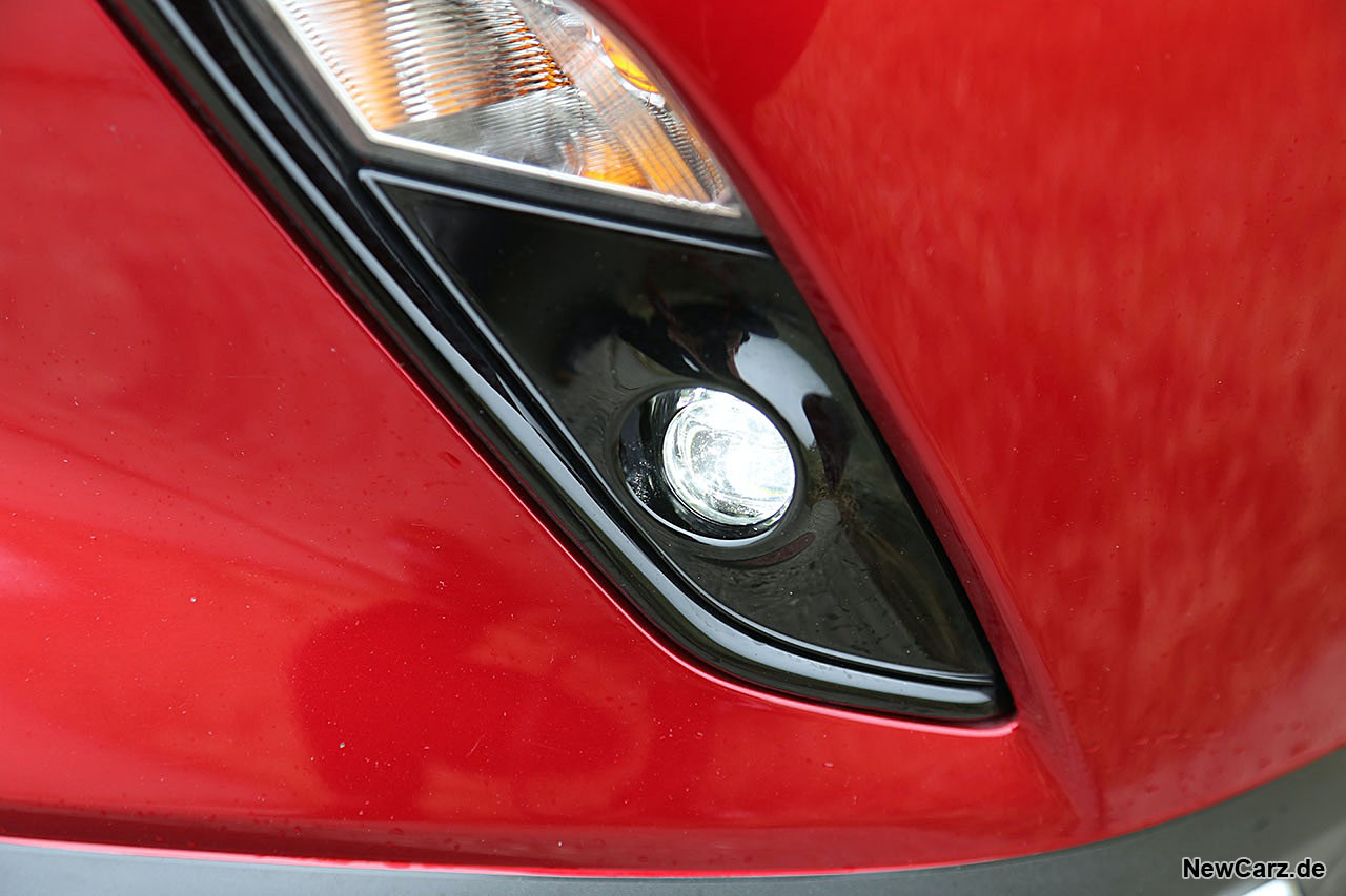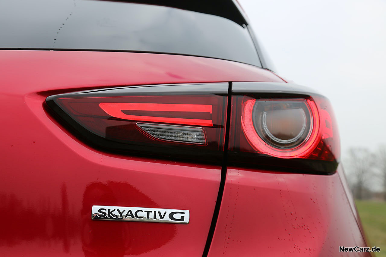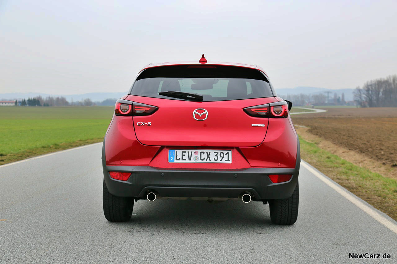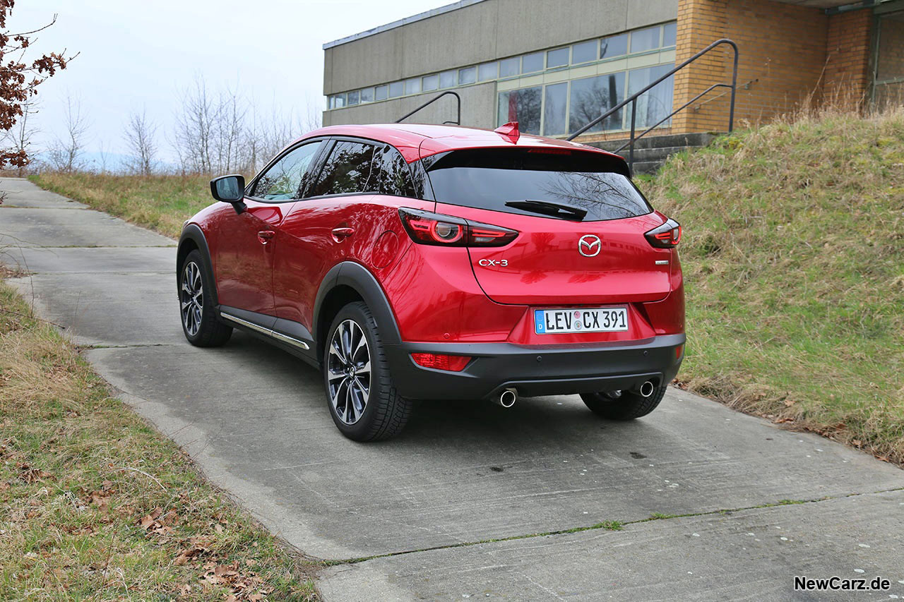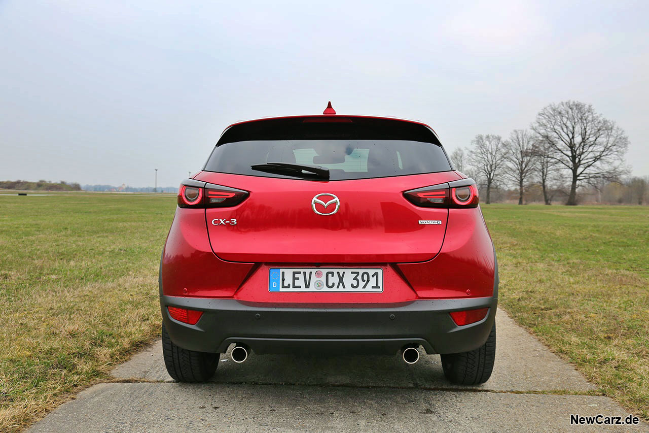 Das Heck kommt trotz seiner kompakten Abmessungen recht massiv daher, bietet schicke Heckleuchten und zwei kleine Endrohre, die den symmetrischen Charakter unterstreichen. Das Magmarot steht auch dem kleinen SUV der Mazda-Modellreihe ausgezeichnet.