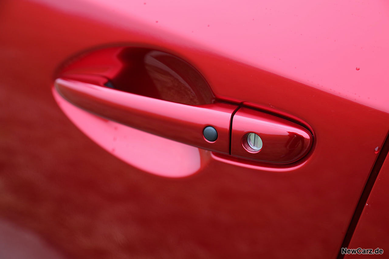 Ein großer Vorteil in beengten urbanen Bereichen: Der CX-3 klappt beim Verriegeln die Außenspiegel an. Das schlüssellose Zugangssystem funktioniert zudem bestens, wenn auch die Ver- und Entrieglung nur an den vorderen Türen sowie an der Heckklappe möglich ist.