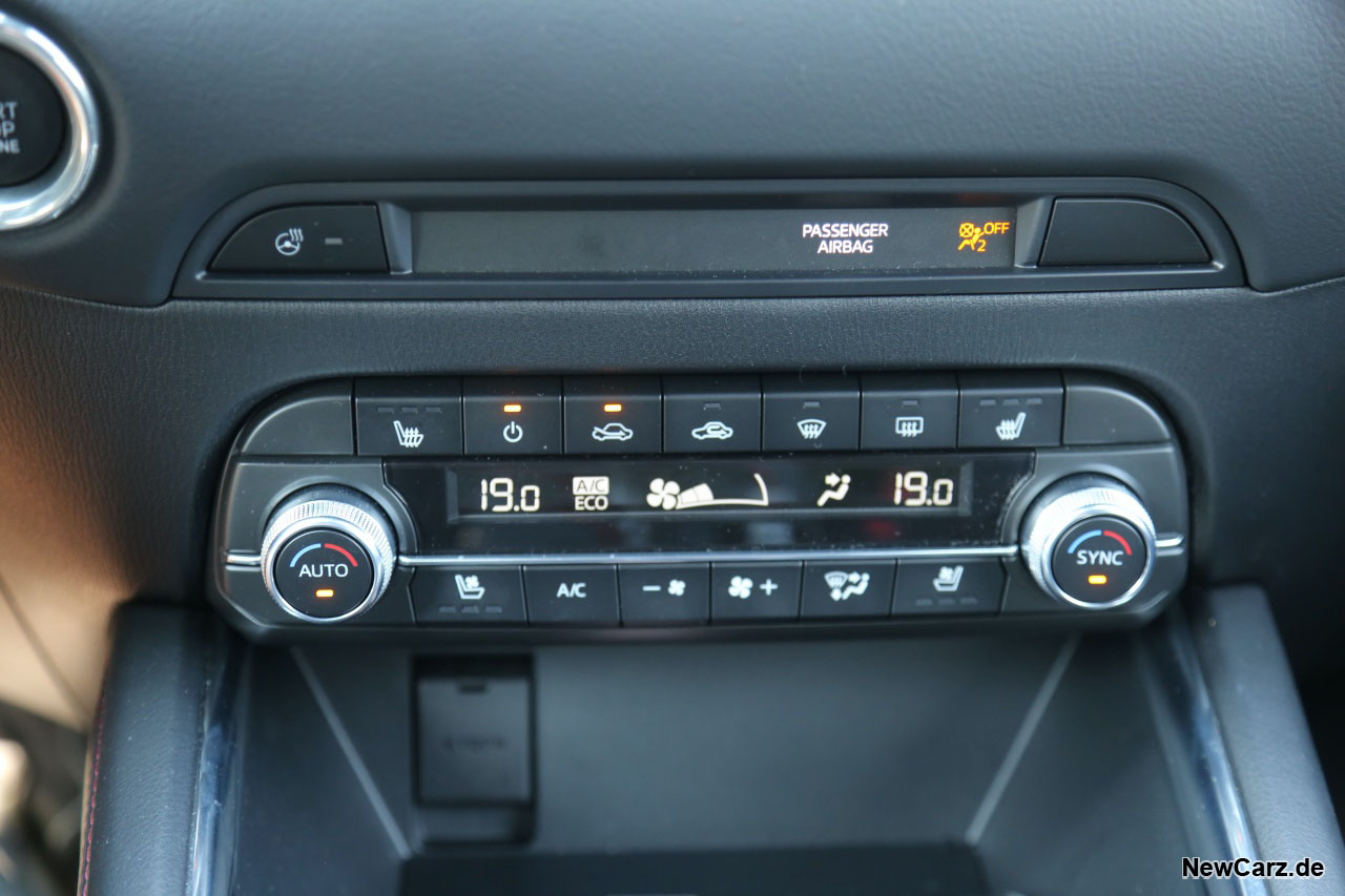 Ärgerlich: Leider heizt die Lenkradheizung – wie bei allen bisher getesteten Mazda-Modellen – den Lenkradkranz nur rechts und links. Wir hatten gehofft, dass diese halbherzige Wärmebekundung mit dem Facelift geändert wurde – leider nein.