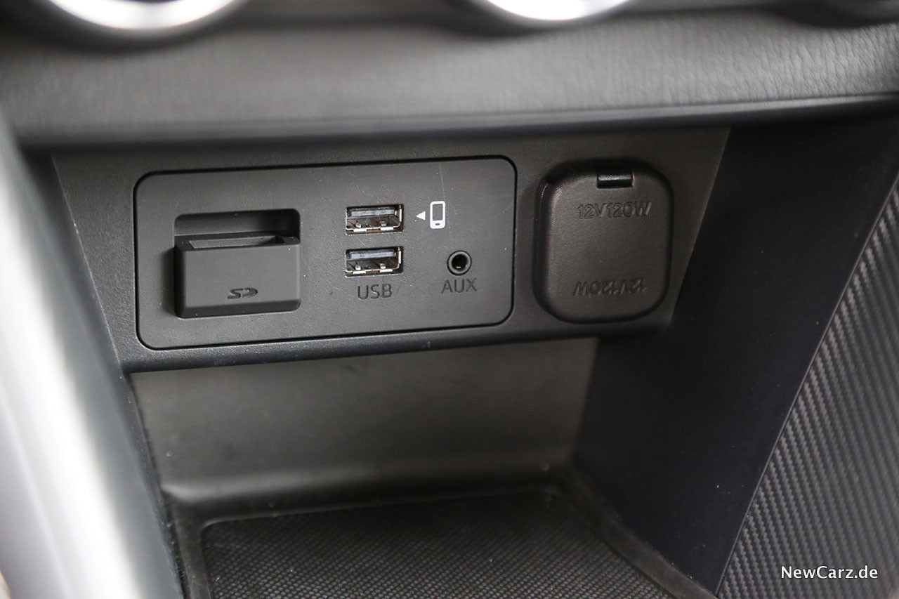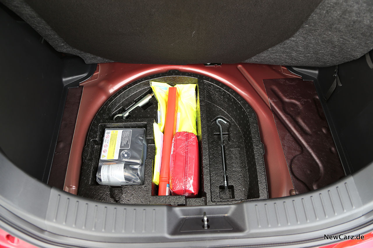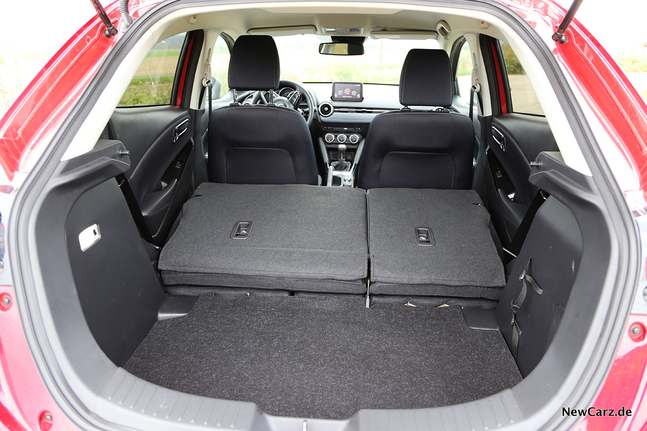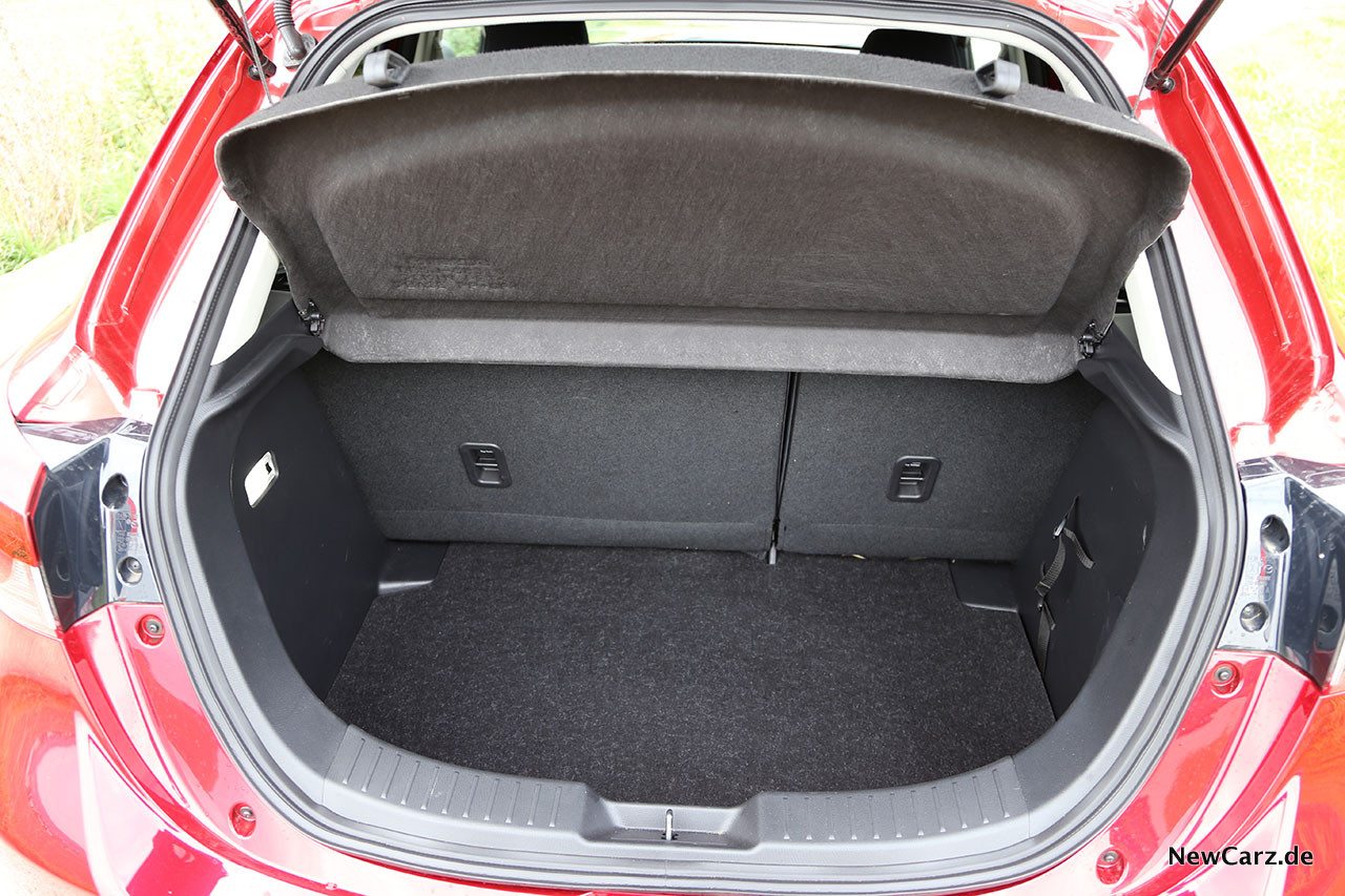 Der Kofferraum des Mazda2 bietet durchschnittlich Raum – lässt sich aber durch Umklappen der Rückenlehnen erweitern und offeriert mit einem knappen Kubikmter ein passables Ladevolumen, welches den Wocheneinkauf problemlos und durchaus auch den ein oder anderen Abstecher in den Baumarkt verdauen kann.