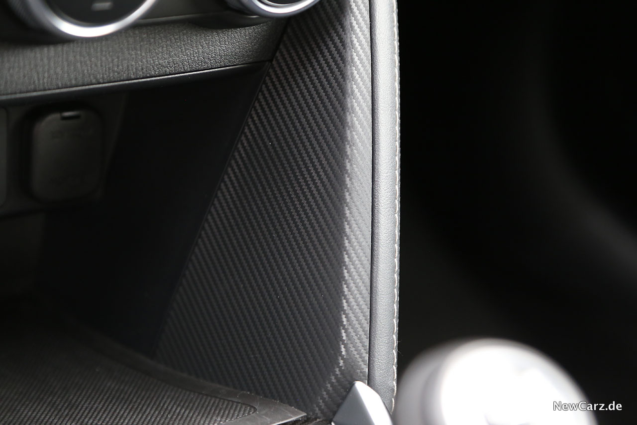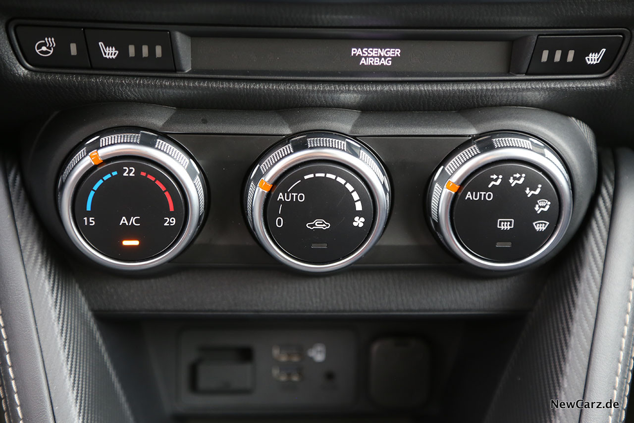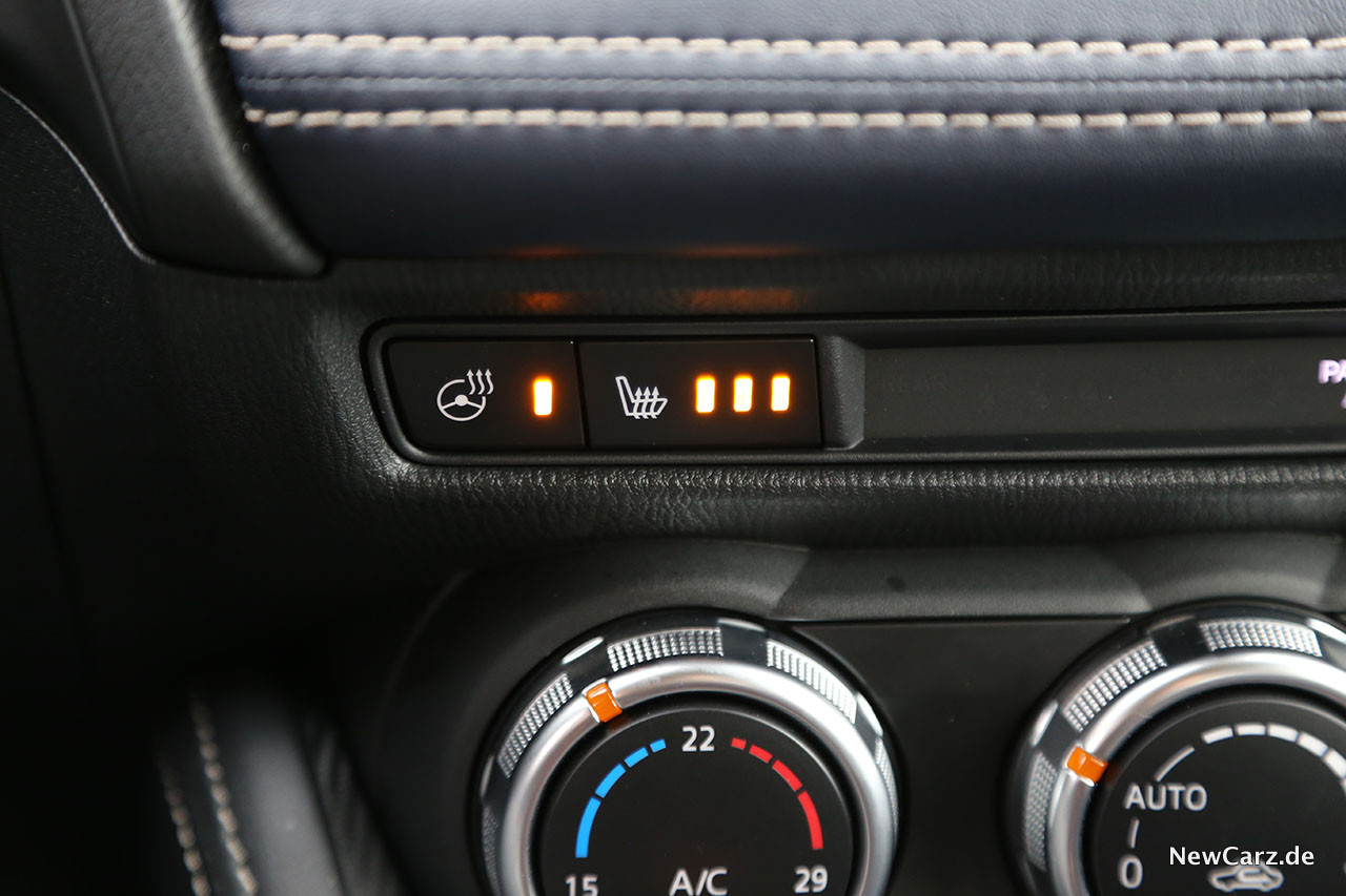 Apple CarPlay und Android Auto funktionierten problemlos in unserem Testwagen, die Verbindung klappte reibungslos und schnell. Eine Sitzheizung befand sich ebenfalls an Bord, eine Lenkradheizung auch und diese hat die typische und unschöne Mazda-Manier: Lediglich rechts und links wird der Lenkradkranz beheizt – der Rest bleibt kalt.