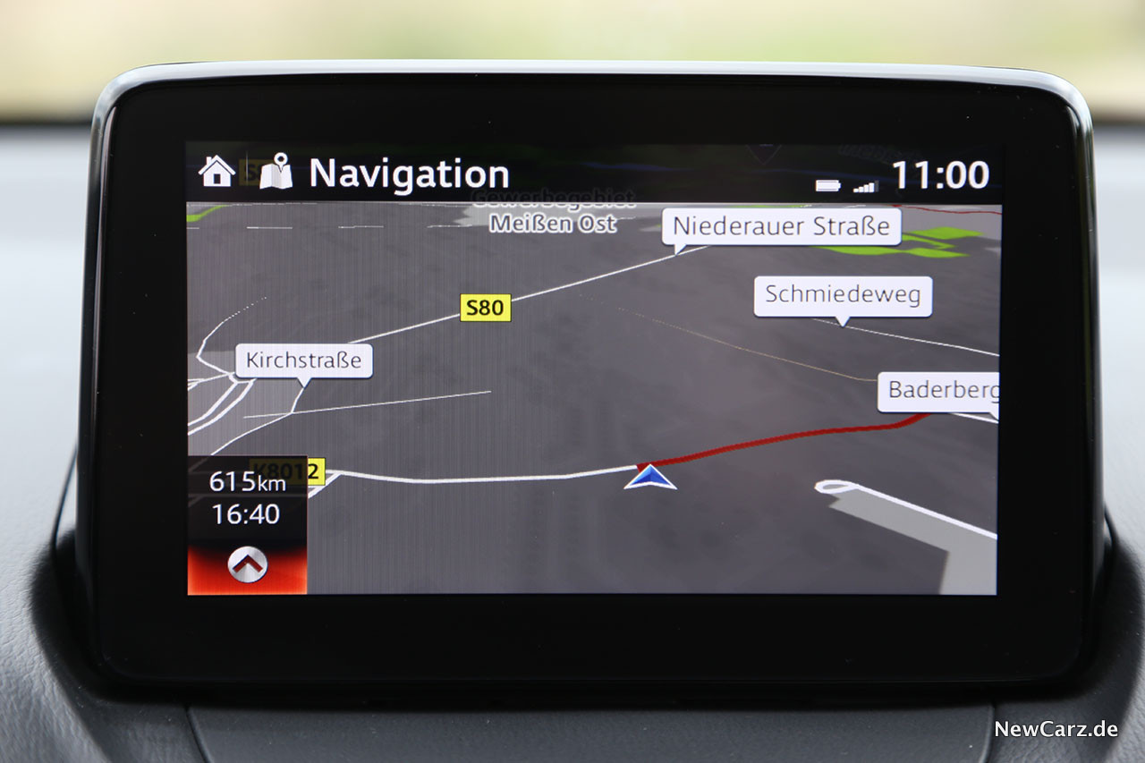 Die Routenführung sowie die Kartendarstellung des Navigationssystems im Mazda2 Facelift ist zuverlässig und mit 732 Euro auch nicht zu preisintensiv. Wenn man aber ohnehin überwiegend das Smartphone koppelt und via Google navigiert, kann man an dieser Stelle bedenkenlos sparen.