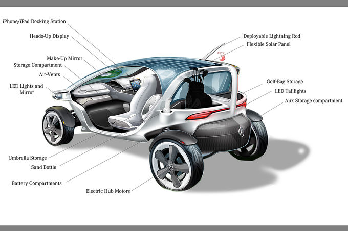 Chefdesigner Gorden Wagener hat hier ganze Arbeit geleistet: ein Golf Cart, das – in Normalfall – alles andere als luxoriös oder komfortabel ist, so zu entwerfen, dass es mit Fug und Recht den Namen Mercedes tragen darf.