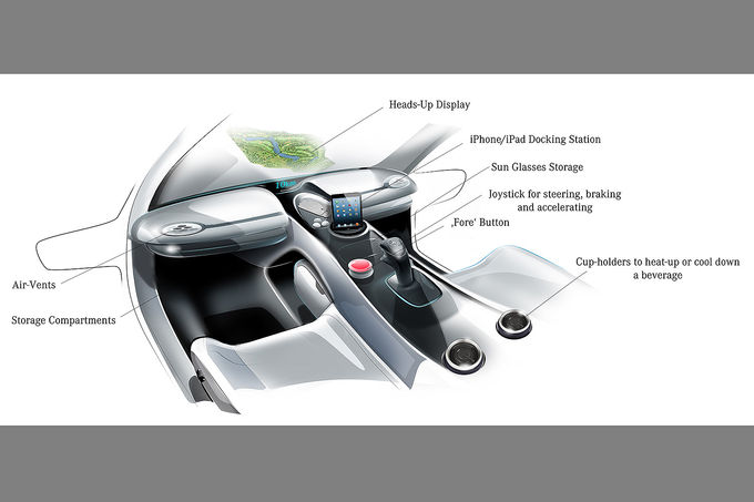 Für Info- und Entertainment sorgt das eigene iPhone oder iPad, das an einer drehbaren Dockingstation angebracht wird. Dort wird von Lautsprecher, Klimaanlage über Head-Up Display sowie die Multi-Media-Anlage alles geregelt.