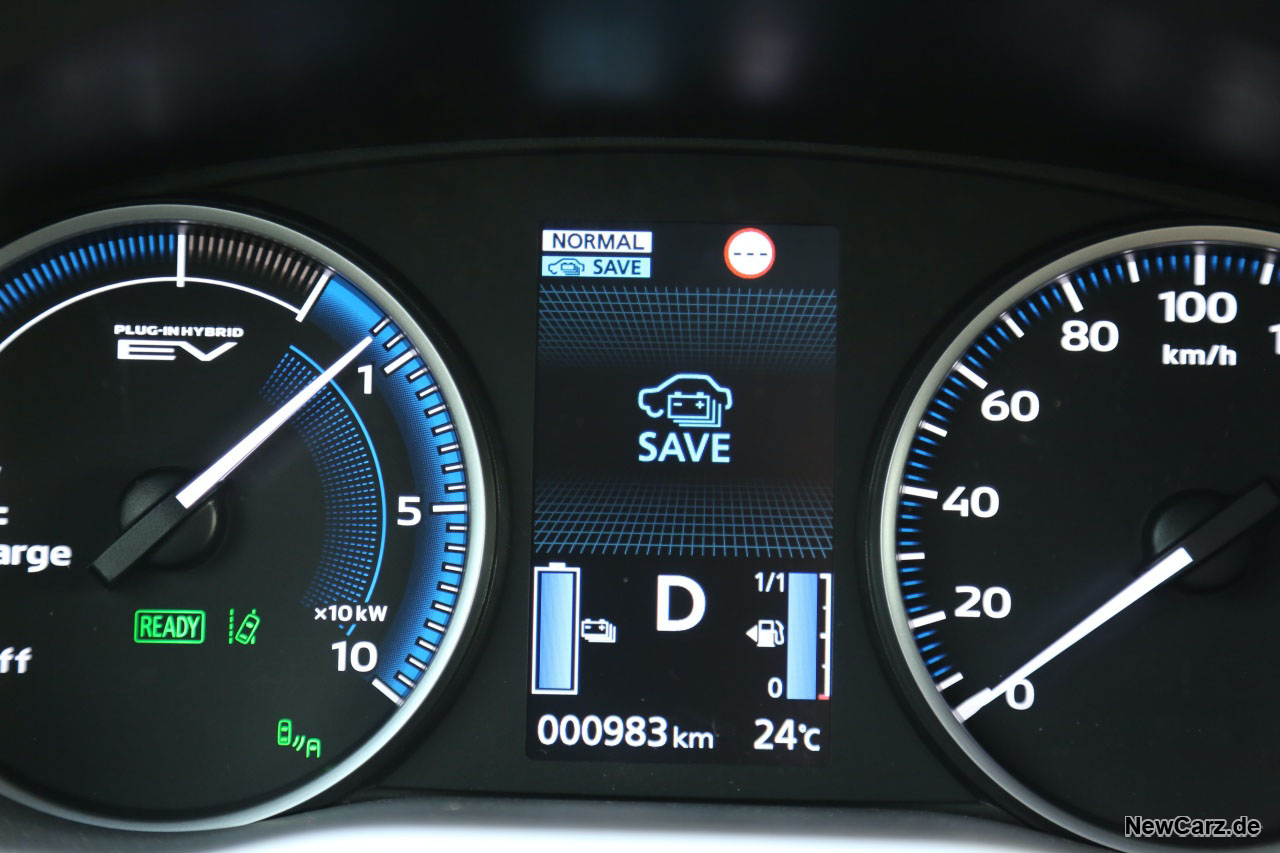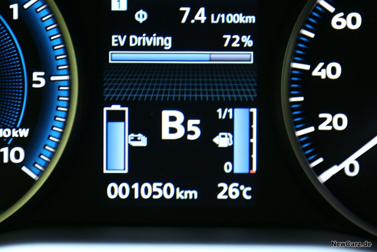 Auf der Autobahn mit permanentem Vollgas funktioniert dies nicht und nach einiger Zeit, in der die Batterie komplett leergesaugt wurde und der Motor mittels einer 1-Stufen-Direktkupplung mit dem Antriebsstrang verbunden wird, warnt das System vor verminderter Leistung und dies spürt man dann auch. Denn bei diesen längeren Vollgasfahrten muss der Benziner alleinig den Vortrieb bewältigen und kann keine zusätzliche Ladefunktion übernehmen.