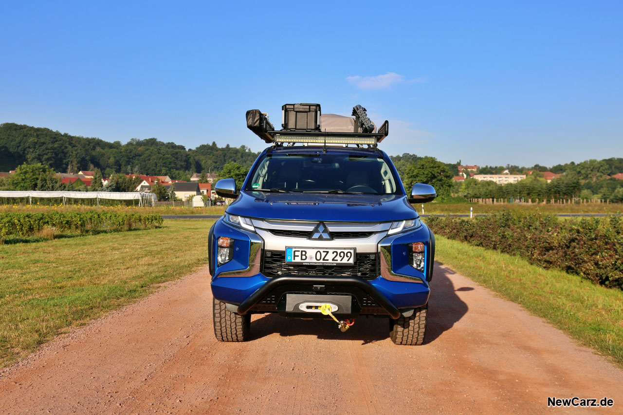 Ein Auto, das schon beim Betrachten eine Mischung aus Staunen und Entsetzen auslöst, was jedoch keinesfalls negativ gemeint ist. Die Front zeigt den L200 mit dem typischen, schicken Gesicht und einem massiven Aufbau sowie einer Seilwinde im unteren Bereich, die wir bereits vom L200 Off Road kennen. Man sieht bereits aus dieser Perspektive, dass dieser L200 eine ganze Menge mit sich trägt.
