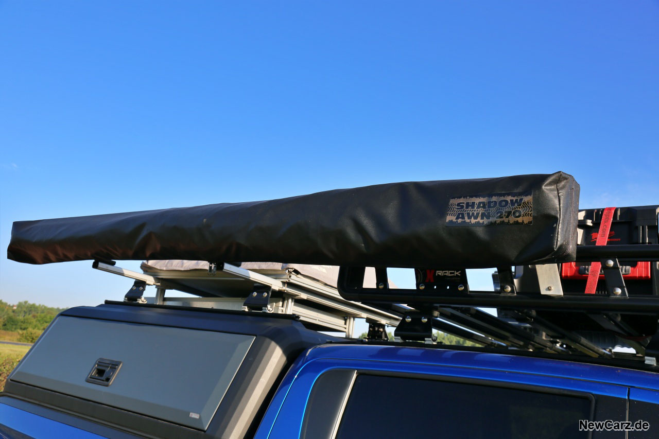 Weiterhin befindet sich an der rechten Seite am Dach des Hardtops eine um 270 Grad ausklapp- und aufspannbare Markise, damit man seine Sitzgelegenheiten im Schatten oder vor Regen geschützt aufstellen kann. Der Aufbau sollte idealerweise zu zweit erfolgen, das geht schneller und man muss sich nicht über eine zu stark durchhängende Markise sorgen.