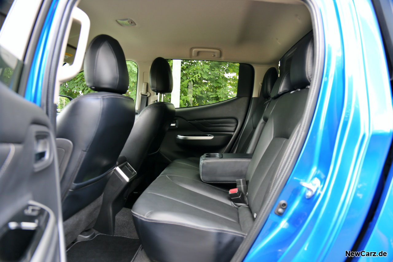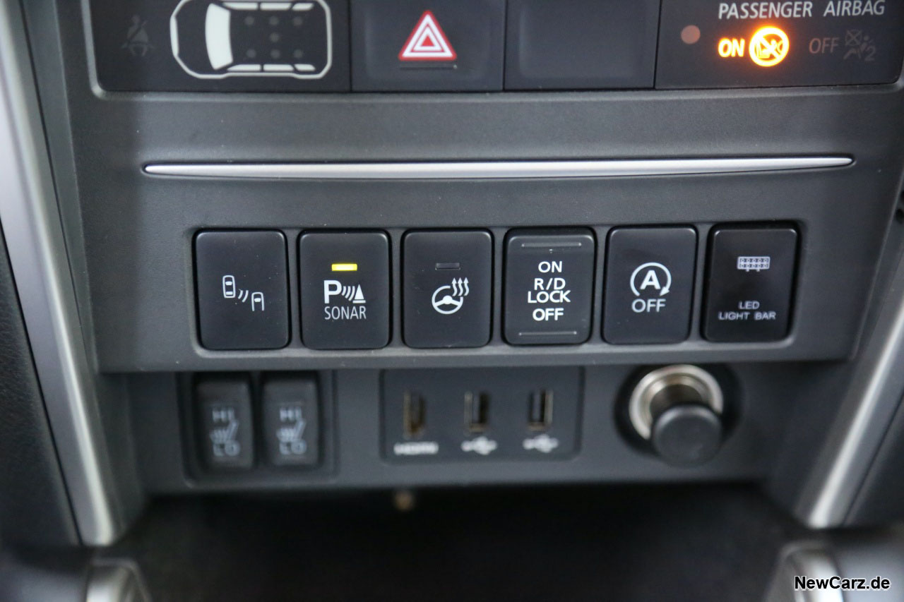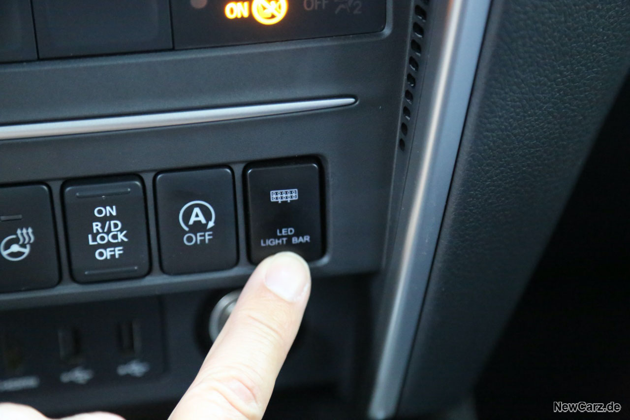 Im Inneren bleibt es recht konventionell, hier bleibt der L200 im Großen und Ganzen serienmäßig. Erst beim zweiten Blick erkennt man einige Dinge, die man im konventionellen L200 vergeblich sucht – wie beispielsweise eine Taste für die LED-Scheinwerferleiste auf dem Dach.