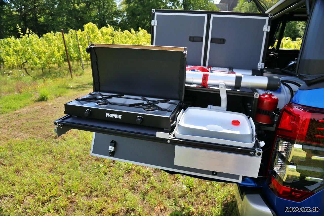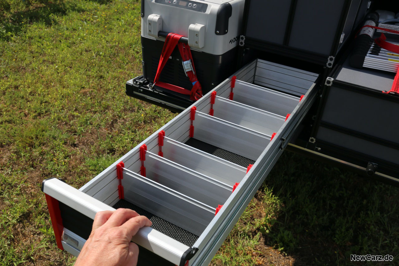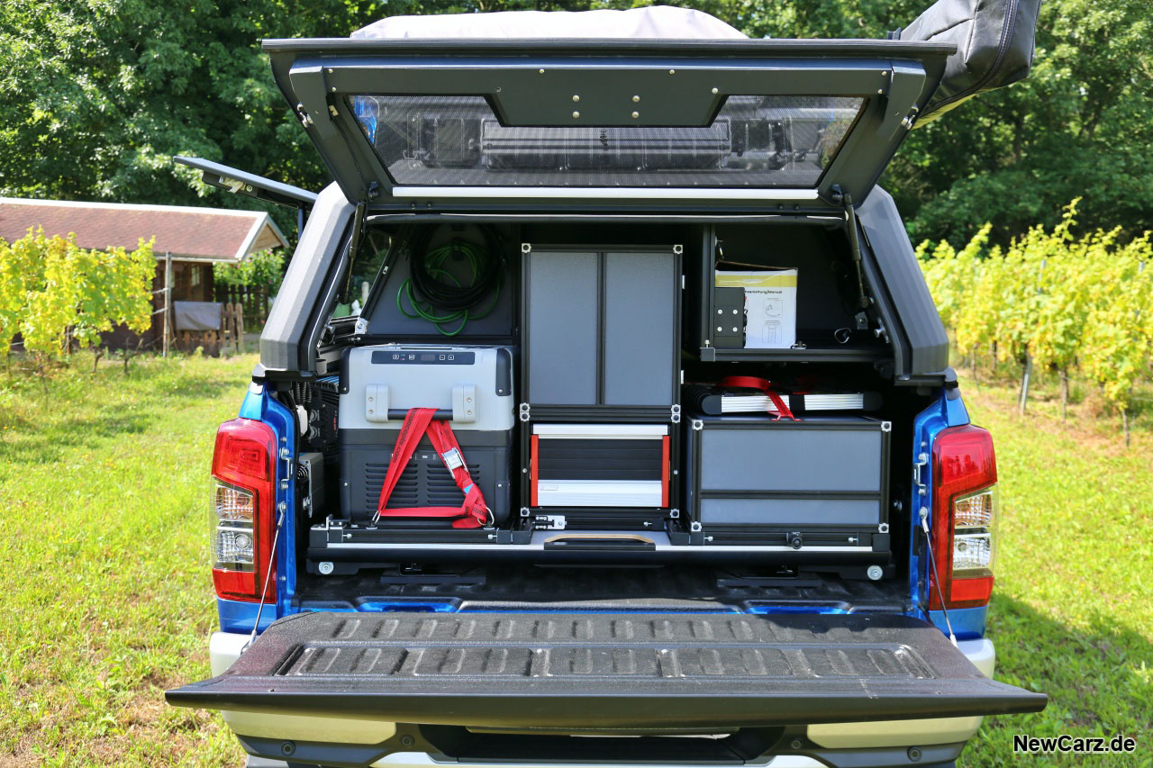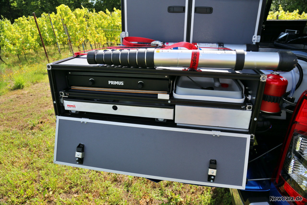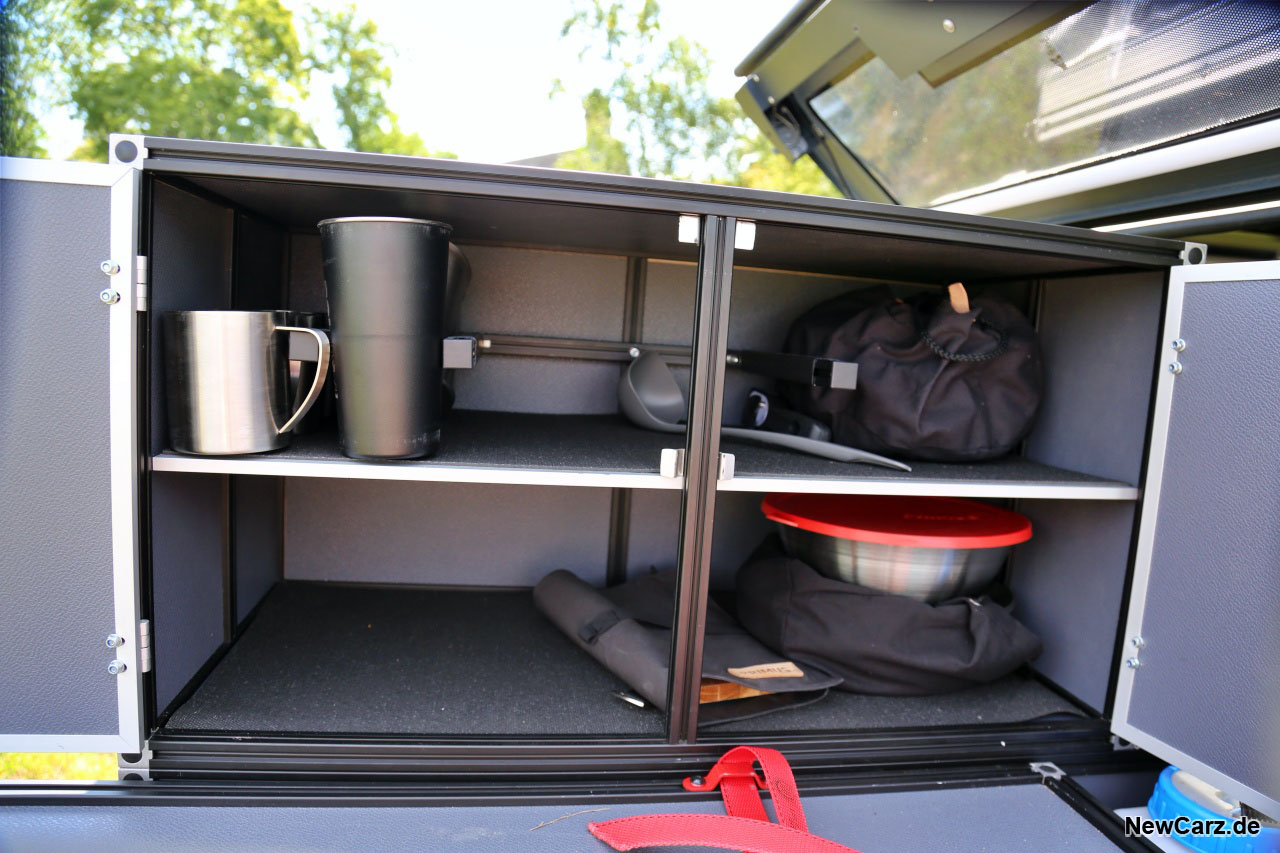 Das Heck kommt derweil einer Schrankwand gleich, diverse Schubladen lassen sich hier herausziehen und offerieren Equipment für alle Gegebenheiten, die der geneigte Camper oder Abenteurer erleben kann und will. Dazu gleich mehr.